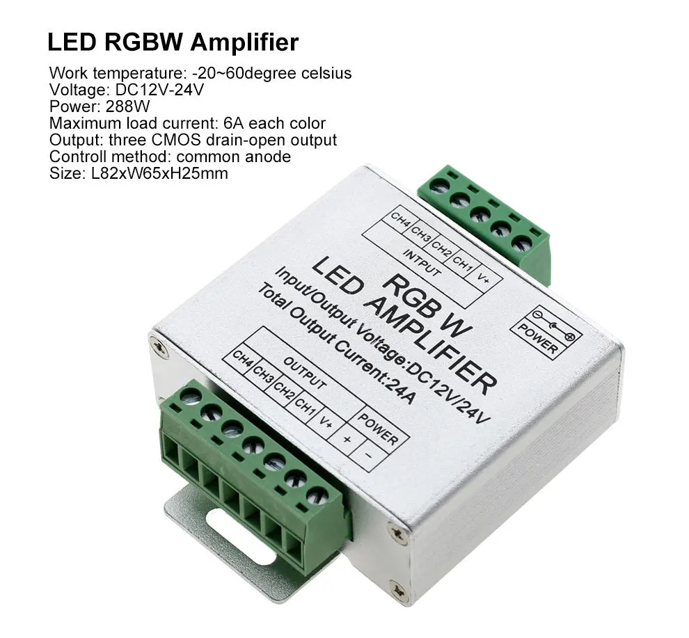 El amplificador de cuatro vías RGBW es adecuado para todos los controladores LED controlados por voltaje y puede aceptar PWM (modulación de ancho de pulso).Con cada amplificador adicional, puede conectar el doble de LED.En teoría, puede conectar innumerables amplificadores de cuatro vías.