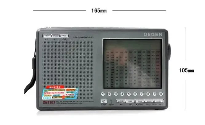 El producto incluye las especificaciones en inglés, enchufe con Europa y América, especifíquelo al comprar. Presentación del producto FM/recepción internacional de onda corta/media/larga. Rango de frecuencia FM: 76,0 a 108,0 MHz Rango de frecuencia de modulación de amplitud: 100-29999 KHZ Lanzadera/Búsqueda Automática/memoria/entrada directa cuatro tipos de modo de sintonización. Almacenamiento permanente de radio 268 Información de memoria permanente Control de volumen electrónico A nivel 64, dos formas de regulación: entrada directa digital y regulación de lanzadera. Pantalla LCD grande, puntero de simulación LCD e instrucciones de doble frecuencia digital. La función de carga inteligente de corriente constante, consulta de cuenta regresiva de carga. Función de recepción y recorte de banda lateral única. Amplitud modulada, ancho de frecuencia media/selección de banda estrecha. Panel naranja retroiluminado, los tres ajustes de modo retroiluminado. Indicador de intensidad de señal de modulación de amplitud. Opción FM Mono/estéreo. Noticias/música dos opciones de sonido. Función de bloqueo de llave de interruptor electrónico. Instrucciones de medidores de onda corta y función de conversión. Instrucciones de celosía de batería para ver la electricidad actual, apagado automático de escasez de electricidad. Antena de varilla larga y mejora la capacidad de modulación de frecuencia y recepción de onda corta. Especificaciones: --------------------------------------------------------------------------- FM (FM) 76-108MHz MW (onda media) 100-1710KHz SW (onda corta) 1,71-29,99 MHz Rango de frecuencia de la banda del medidor: 90M3.160-3.455MHz 75M 3.860-4.055MHz 60M 4.710-5.105MHz 49M5.95-6.20MHz 41M 7,10-7,30 MHz 31M 9,50-9,90 MHz 25M 11,65-12,05 MHz 22M 13,60-13,80 MHz 19M 15,10-15,60 MHz 16M 17,55-17,90 MHz 13M 21,45-21,85 MHz La Banda ancha selectiva de onda corta de banda estrecha es mejor que 50dB mejor que 40dB Limitar la sensibilidad al ruido FM (modulación de frecuencia) es mejor que 10uV MW (onda media) es mejor que 1mV / M SW (onda corta) Que 20uV FM IF el ancho de banda es menor que la segunda banda estrecha menor que 4KHz 6KHz 4 pilas AA fuente de alimentación baterías integradas Fuente de alimentación externa 8V 300mA Altavoz de la máquina D77 mm Tamaño: 165*105*29mm El paquete incluye: 1 * radio DE1103 1 * adaptador de fuente de alimentación 1 * antena externa 1 * auriculares 1 * bolsa de cubierta 1 * manual en inglés Nota: considere la seguridad a través de la Aduana, no pondremos las baterías en el paquete de envío. Gracias por su comprensión.