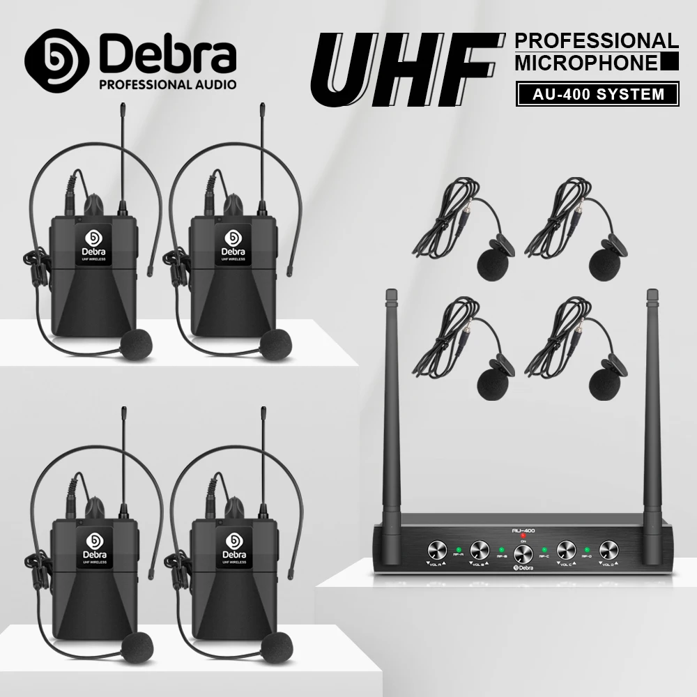 Debra Audio Pro UHF 4 Channels Wireless Microphone System with 4 Bodypack Lavalier Headset Portable Mic for Karaoke Church PartyProduct Description