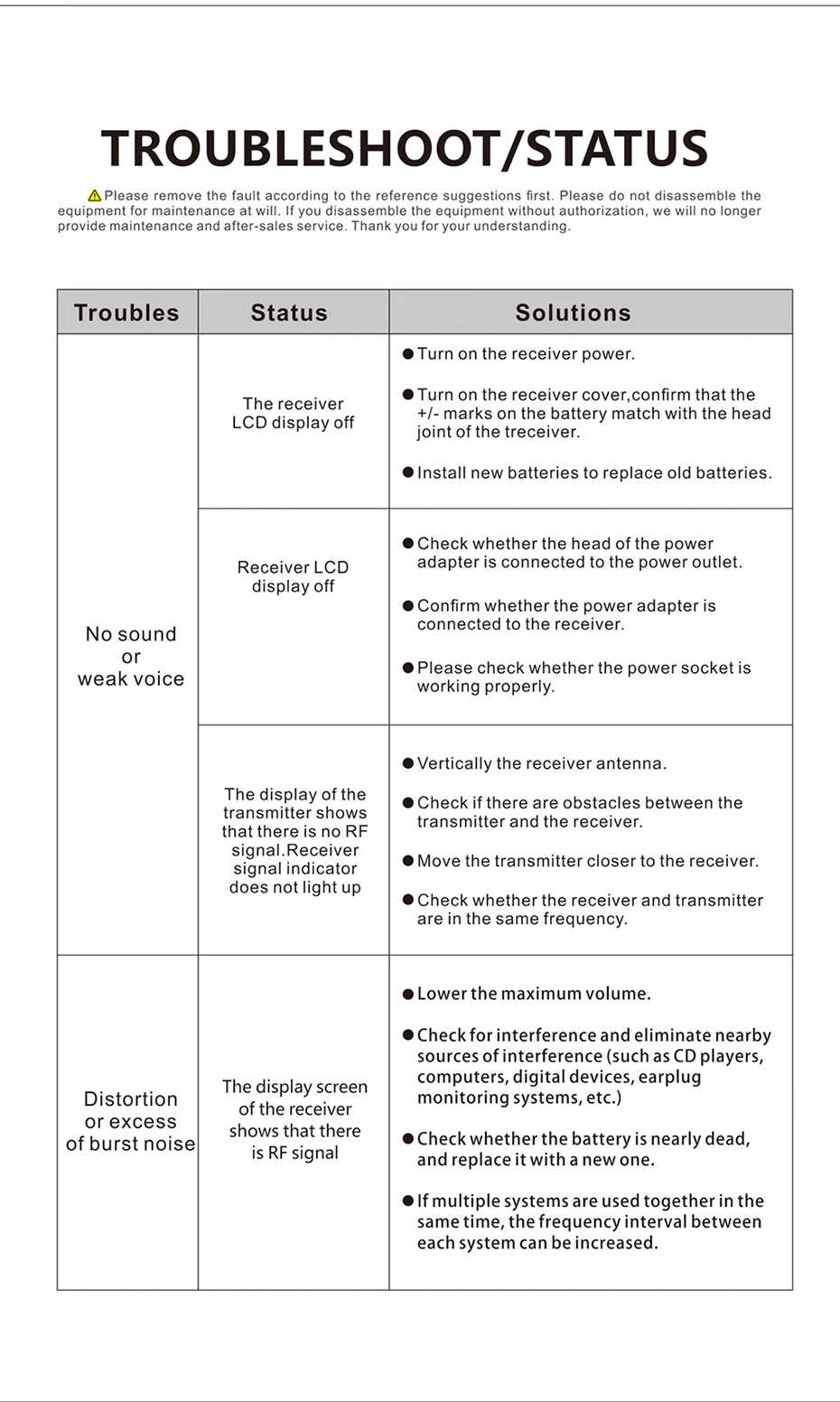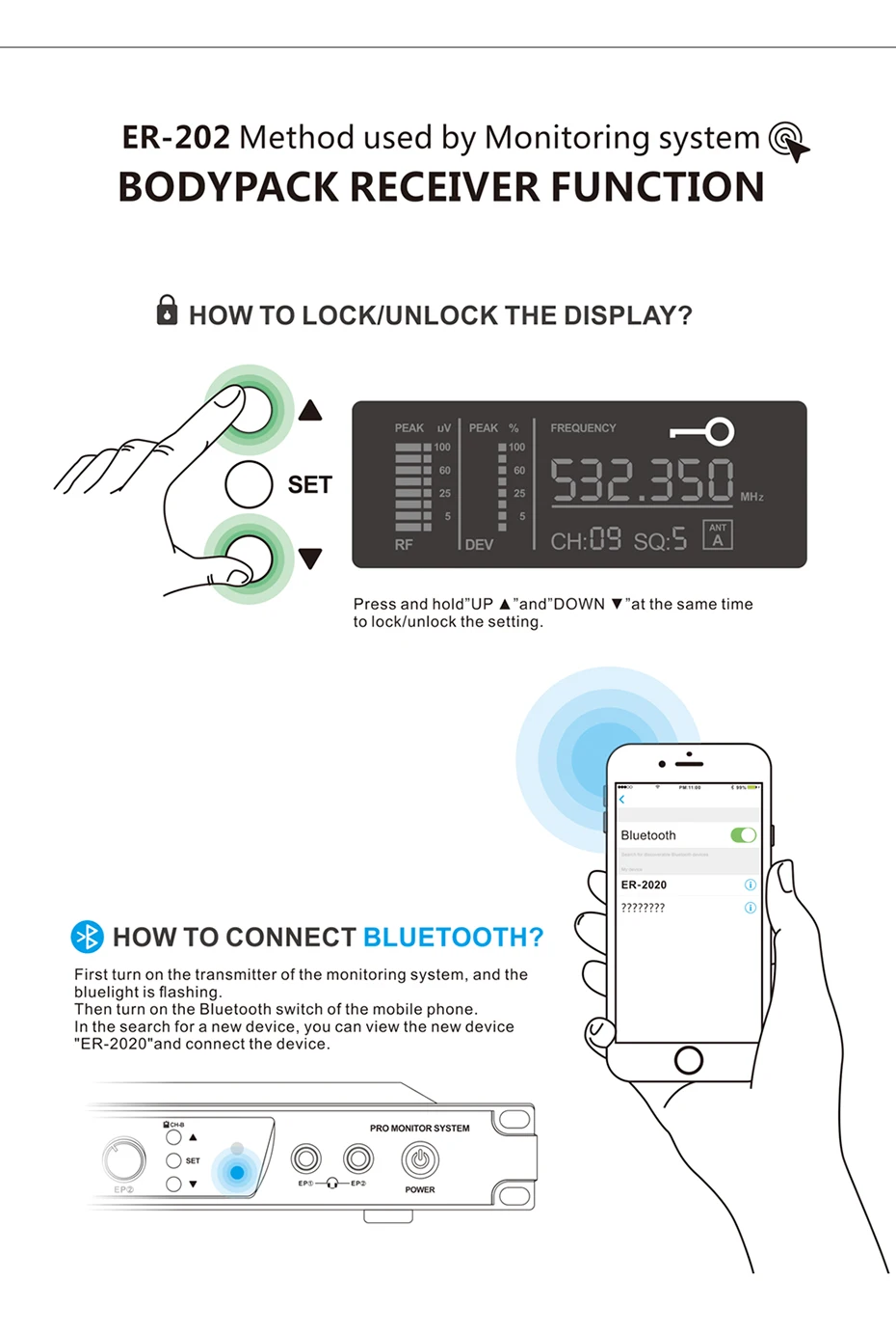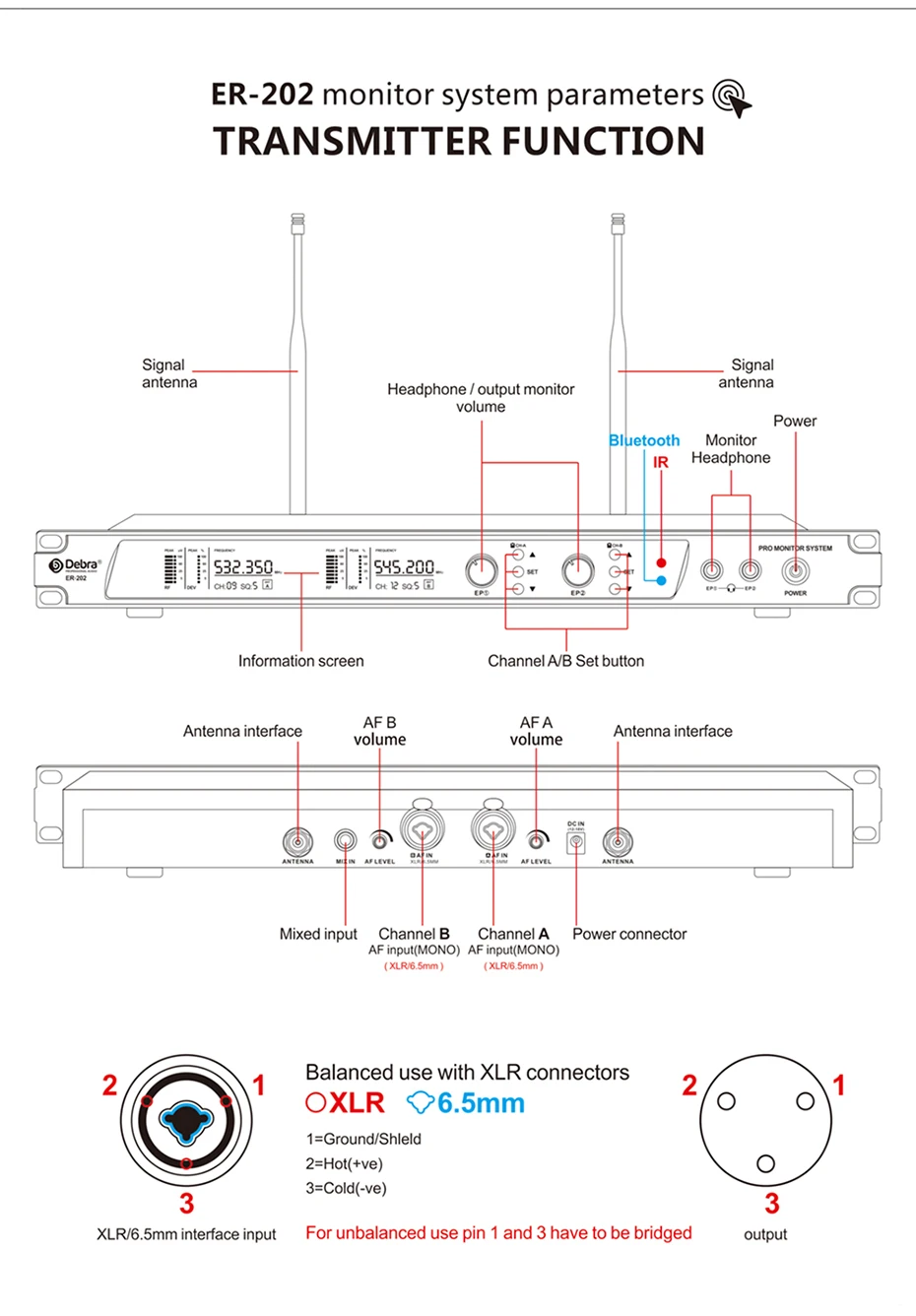 Feature Design: The transmitter has LCD display panel, RF and AF display. The receiver is equipped with LCD display, power supply and RF receiving indicator. The panel can monitor battery power.