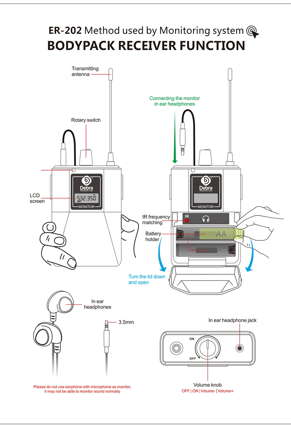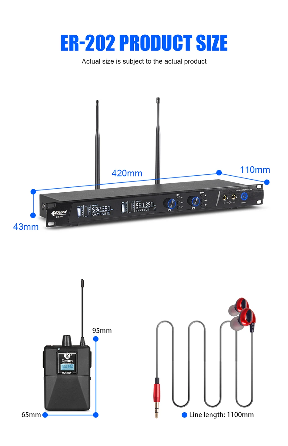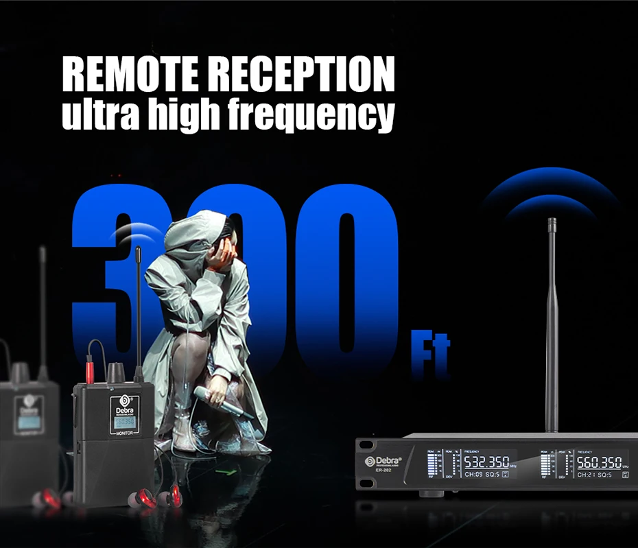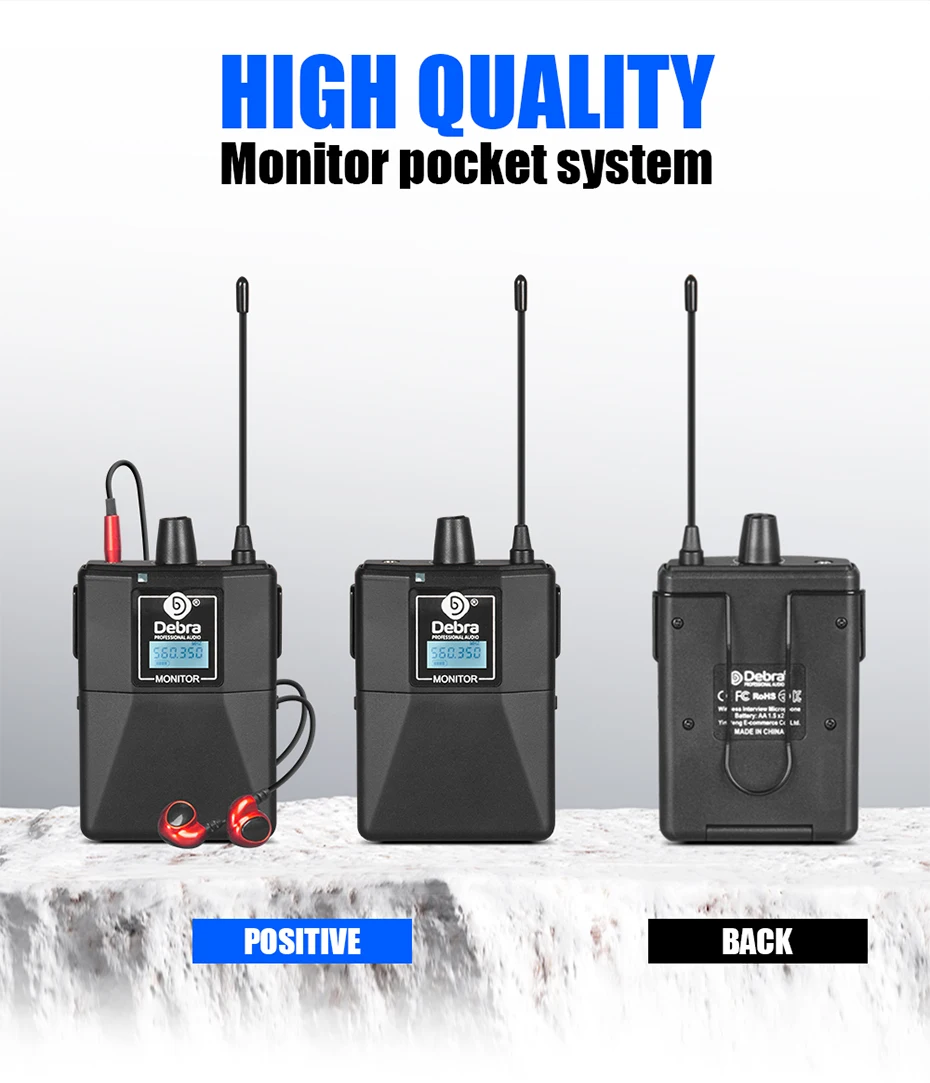 The PRO UHF Wireless In Ear Monitoring System: D Debra Audio's new UHF system with phase-locked loop PLL. It using high-quality IC chips, improves the overall performance, anti-frequency reduction, anti-series frequency, has a stronger and more stable signal, Better signal to noise ratio. Frequency range: 510 MHz-580 Mhz. The preset 100 frequencies for each channel can be switched at will, which can better avoid signal interference.