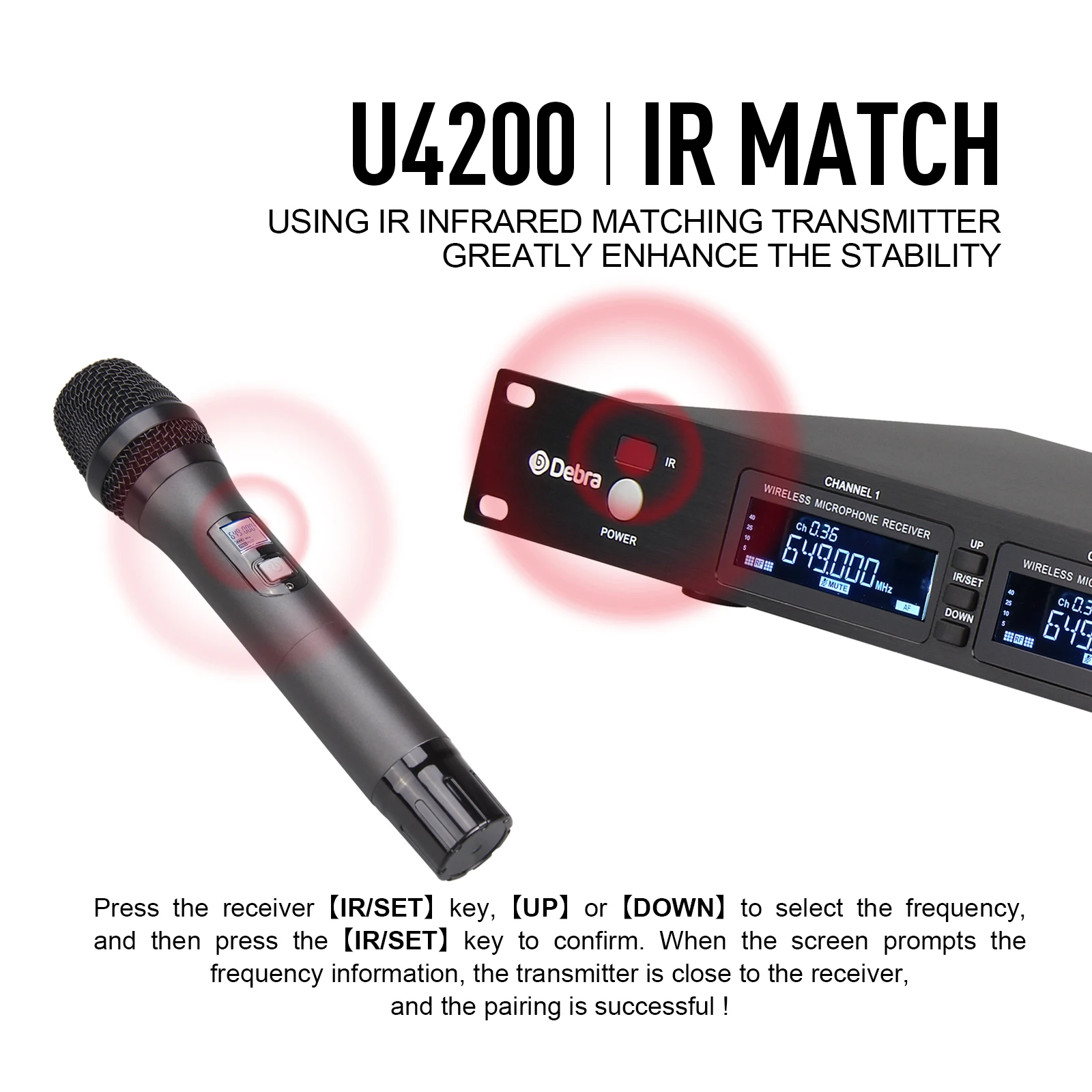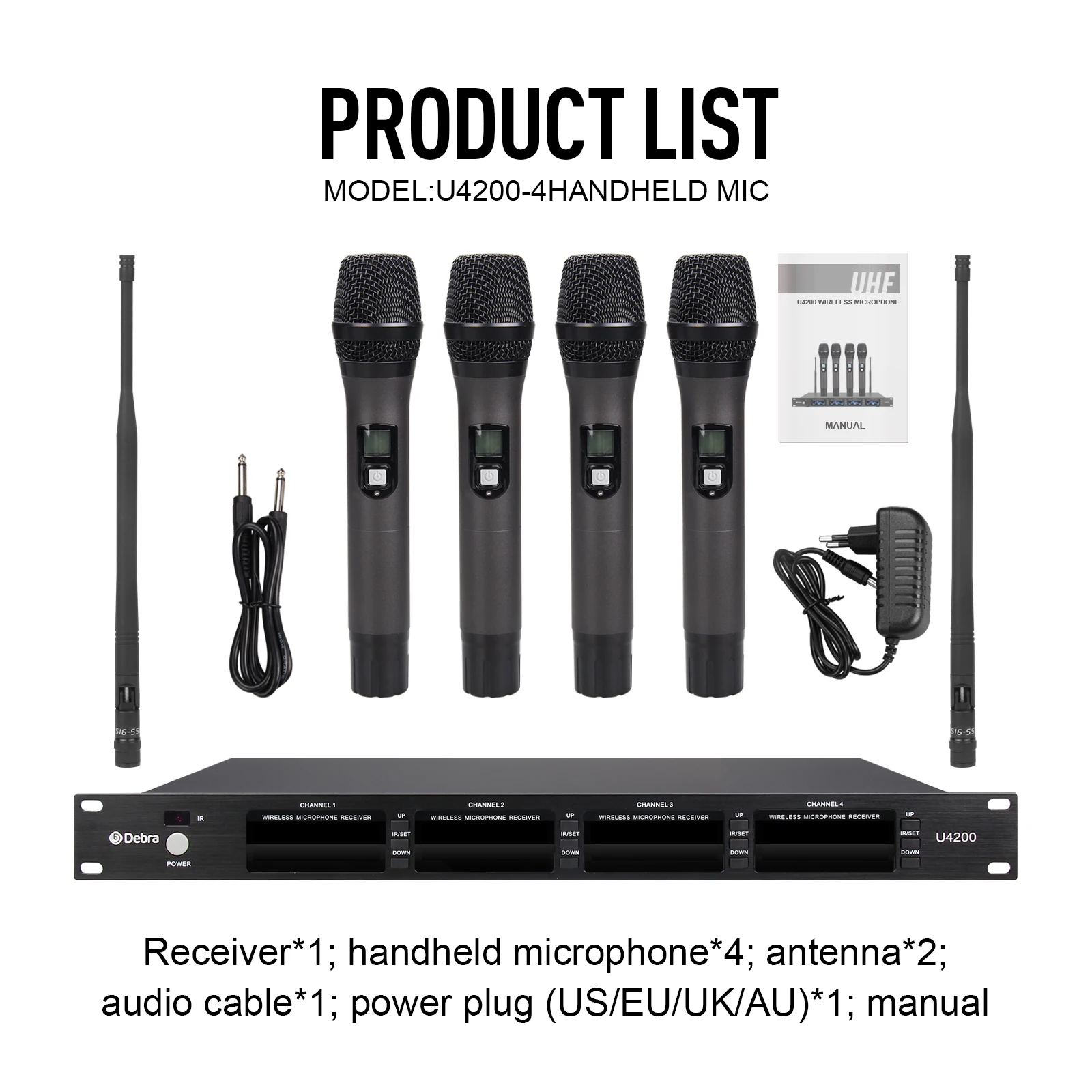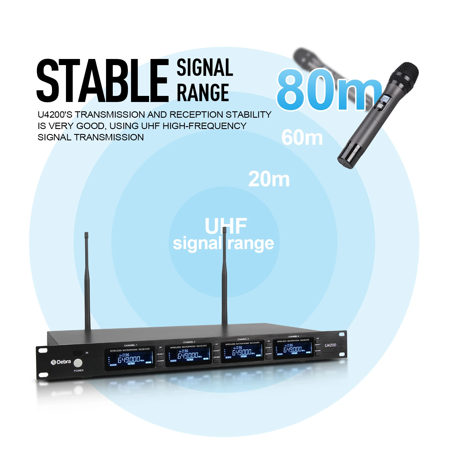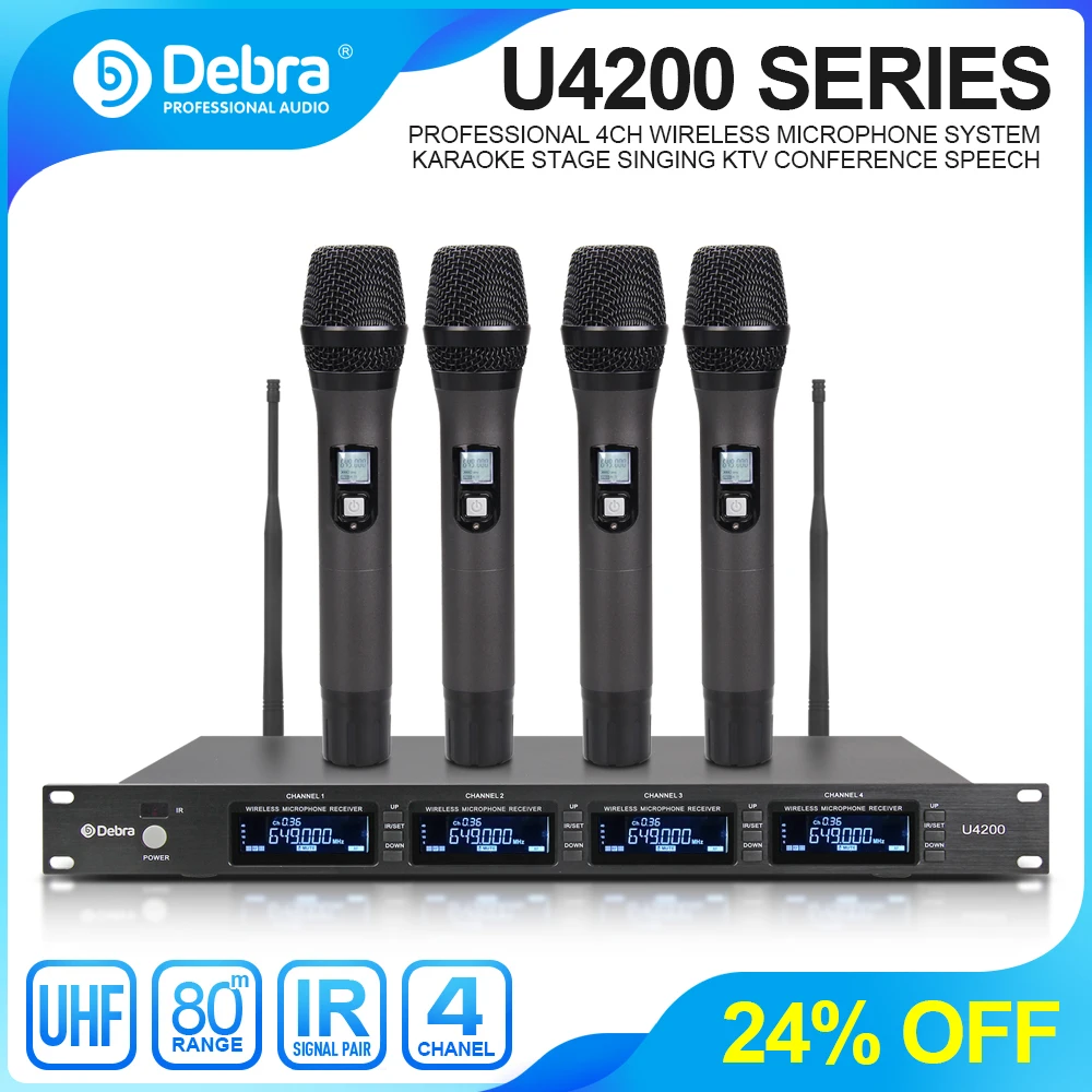Debra-micrófono inalámbrico U4200, accesorio de mano de 4 canales, totalmente de Metal, frecuencia seleccionable, 80m, para iglesia, escenario, discurso
