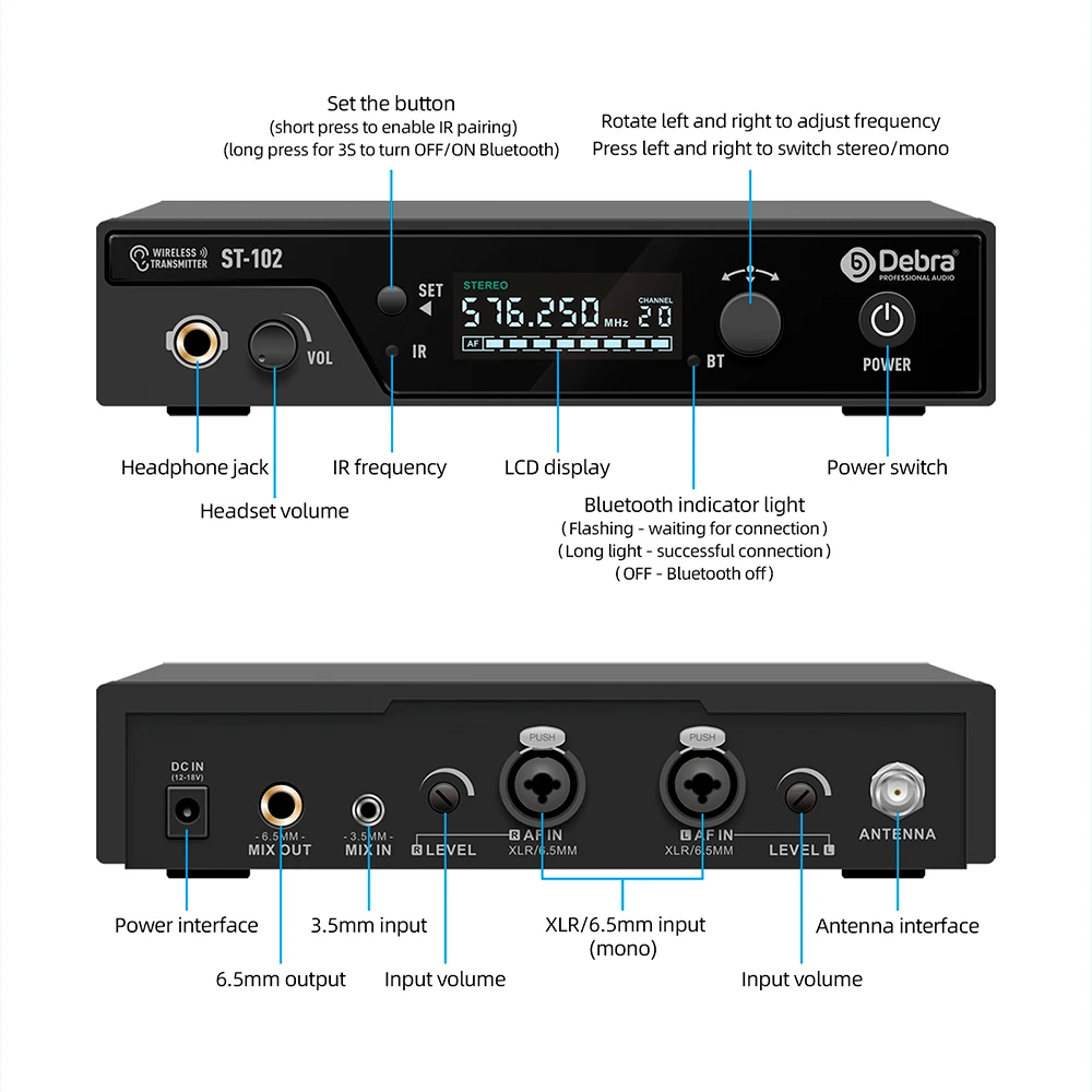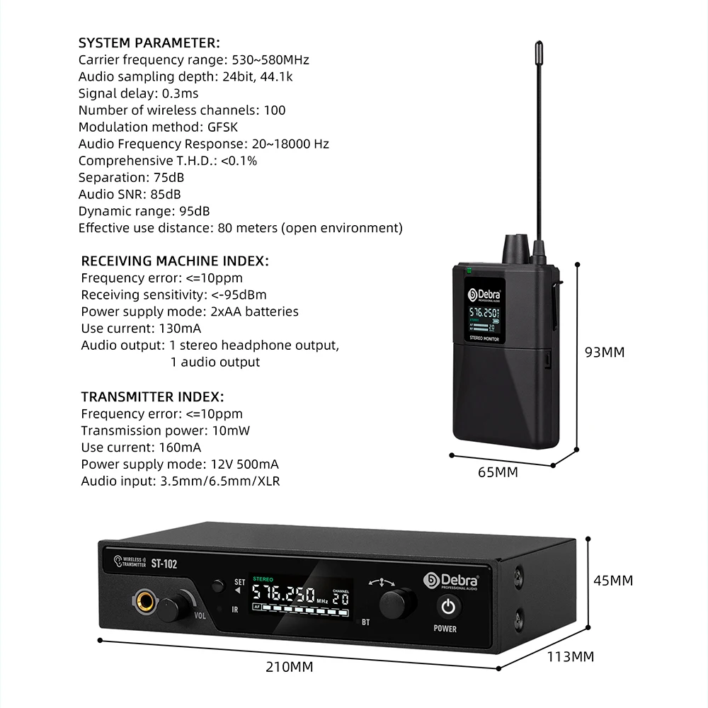 D Debra Audio ST-102 es un sistema de monitoreo inalámbrico intrauditivo estéreo profesional desarrollado por nuestro equipo durante dos años.Utiliza un nuevo chip digital para reemplazar el diseño de circuito tradicional y utiliza transmisión de señal UHF para que el sistema funcione de manera más eficiente y estable.Después de dos años de depuración, el sistema tiene un sonido claro y un ruido blanco ultrabajo, lo que lo hace adecuado para más lugares, como equipos de grabación de alta gama.En cuanto a funciones, hemos configurado un interruptor entre mono y estéreo, permitiéndole adaptarnos a diferentes usos y escenarios según sus necesidades.