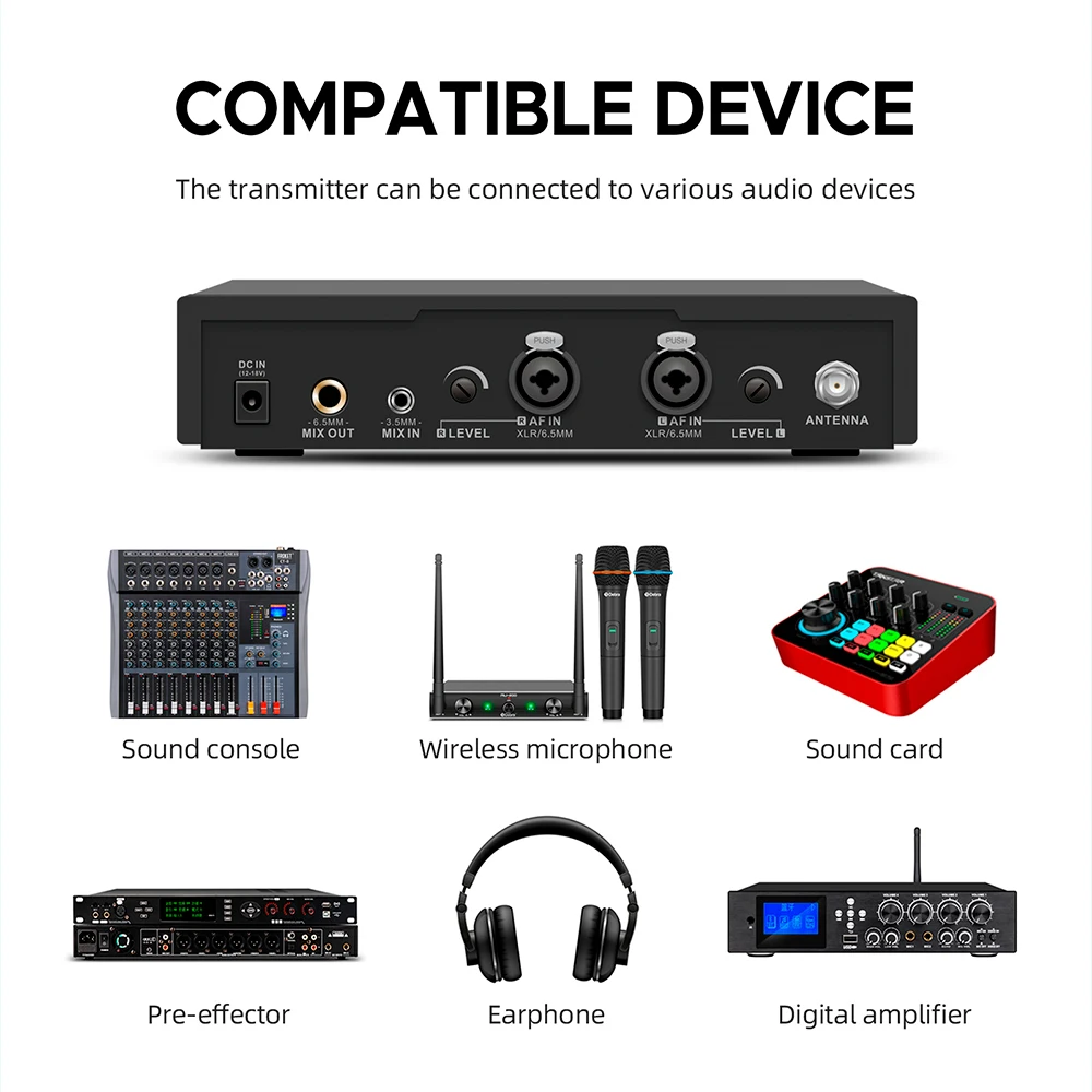 4.Transmisión UHF, uso de alcance de 80 m, entorno abierto de hasta 300 m.