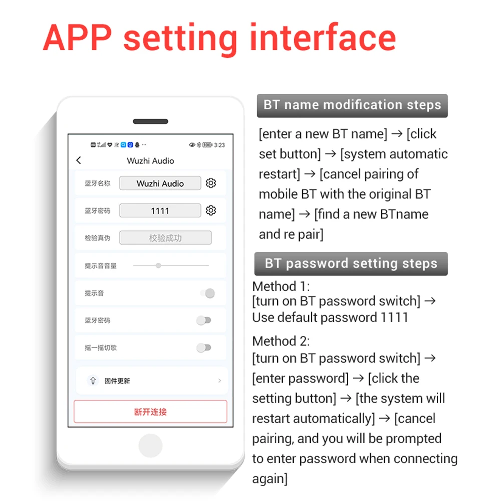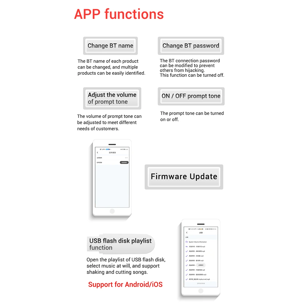 Función de la aplicación: cambiar el nombre compatible con Bluetooth, establecer contraseña, establecer el tamaño del tono de aviso, actualizar el firmware, lista de discos U, canción de cuna, etc.