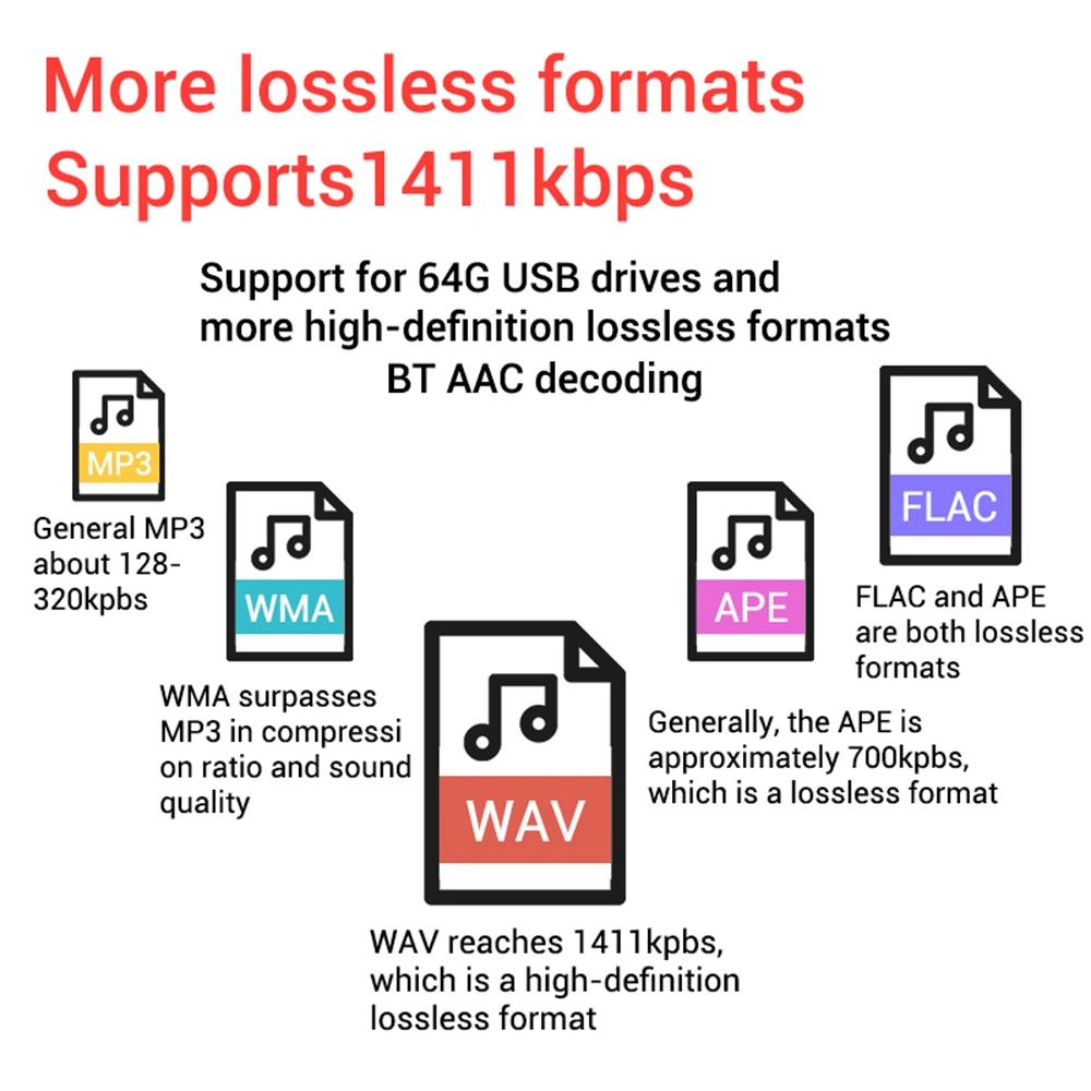 Formato de decodificación de disco U: MP3 WMA, WAV/FLAC/APE sin pérdidas1411kbps/16bit