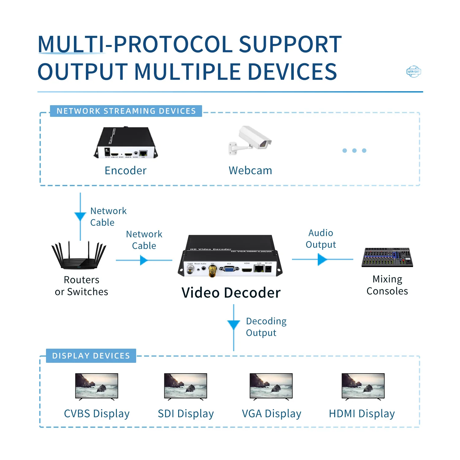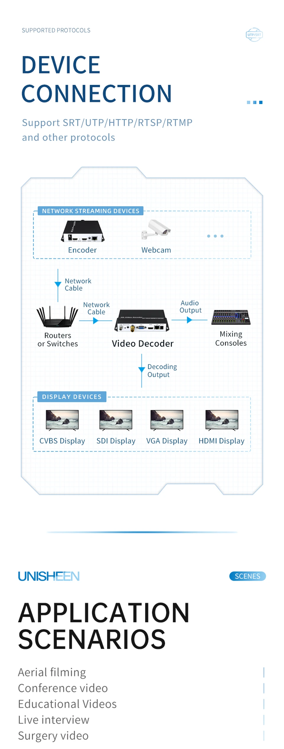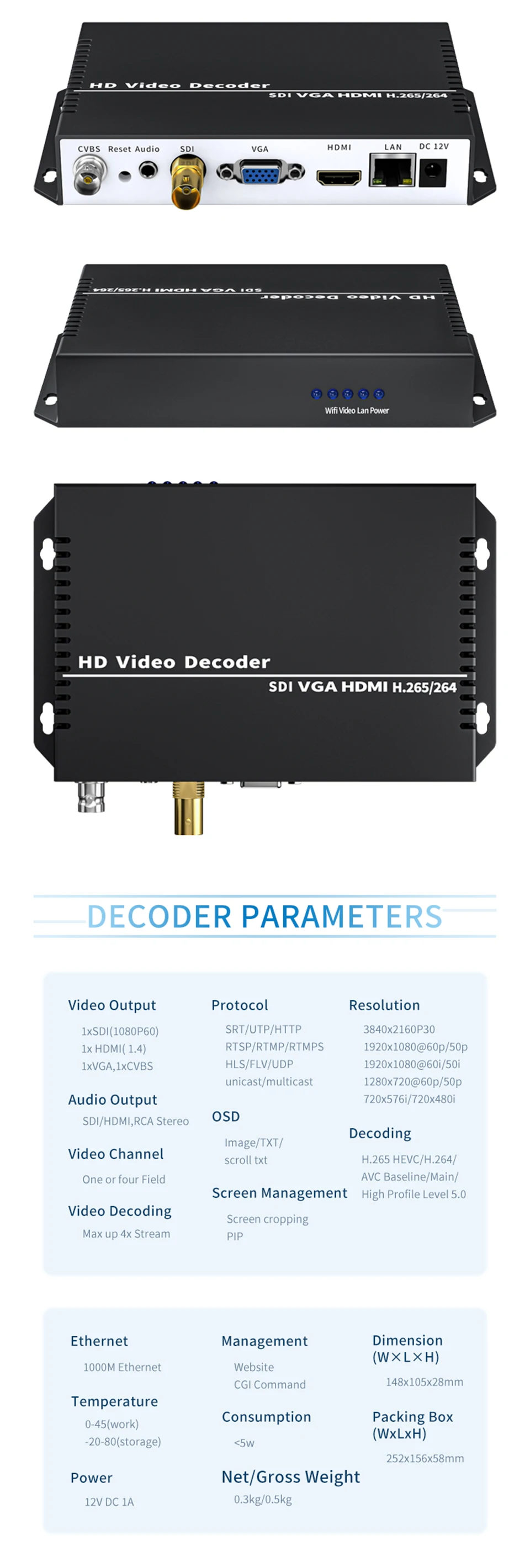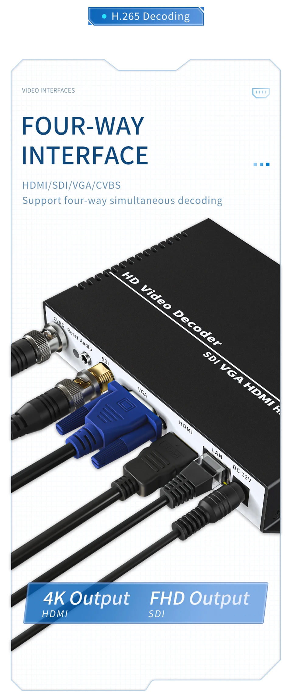 * Soporte 3G/HD salida SDI * Apoyo 2160p30 salida HDMI * Apoyo SRT RTSP UDP RTMP protocolo HTTP * Apoyo SRT/RTMP a Protcol * soporte PIP/cosecha/OSD