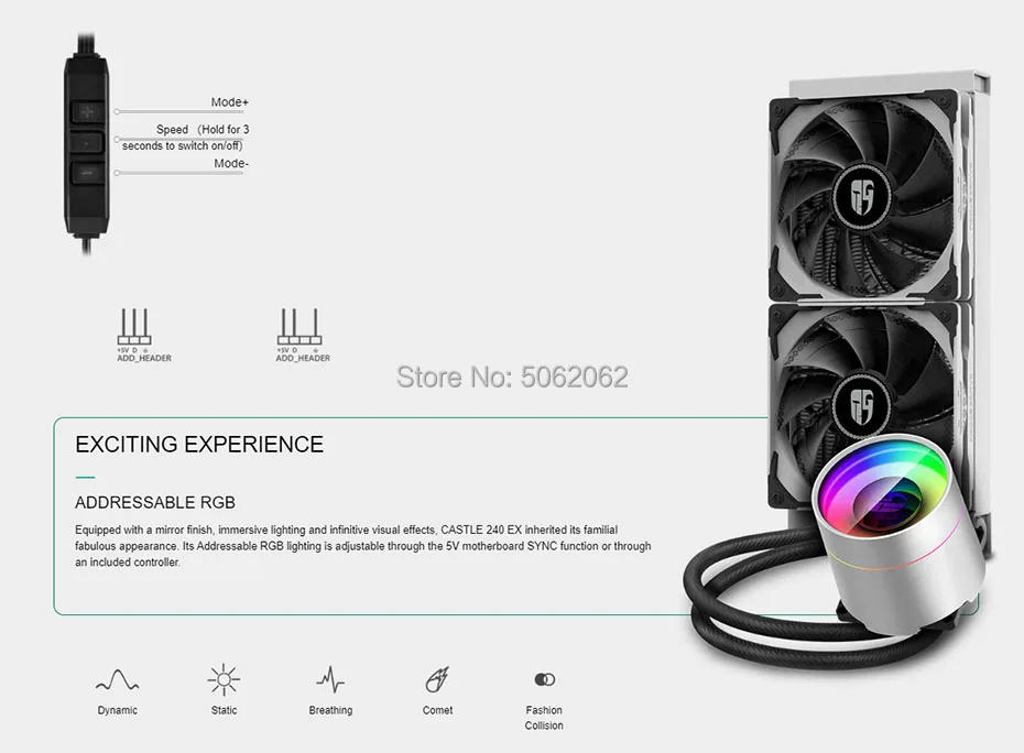 Cabezal frío RGB direccionable de 7,5V, ajustable a través de la placa base o el controlador incluido.