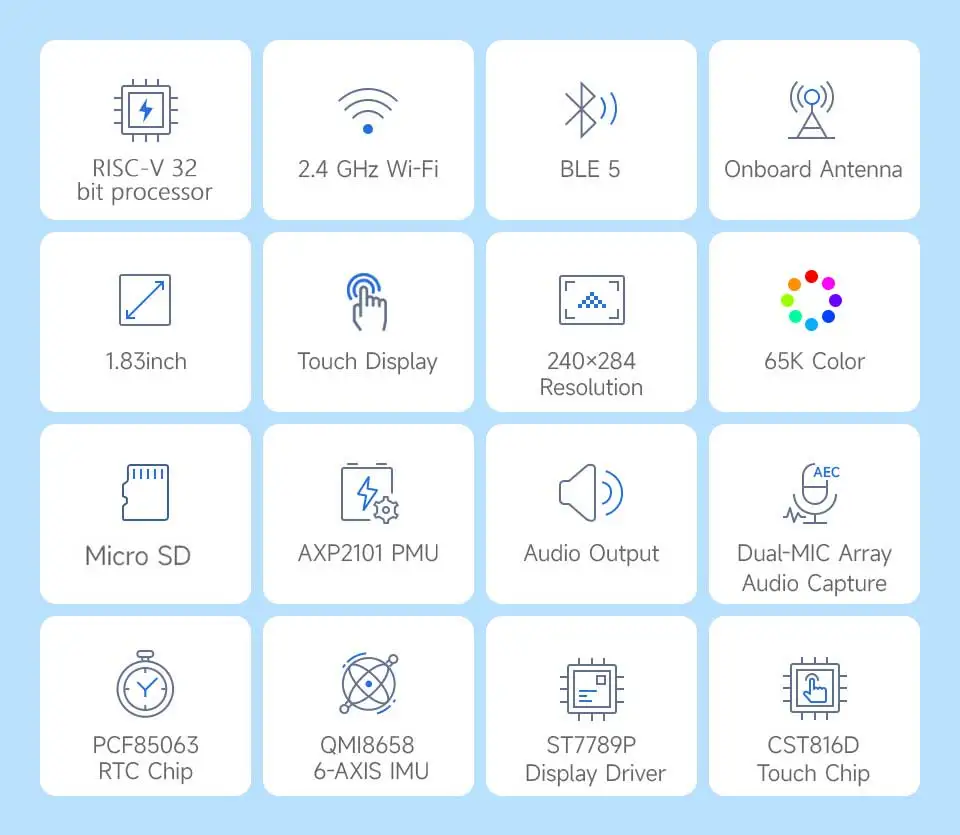 Chip de códec de audio ES8311 integrado, micrófono y altavoz, lo que permite un desarrollo perfecto de aplicaciones de IA.
