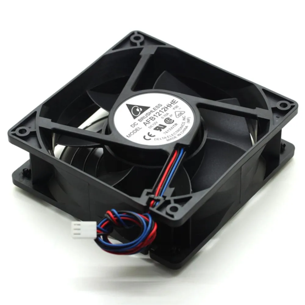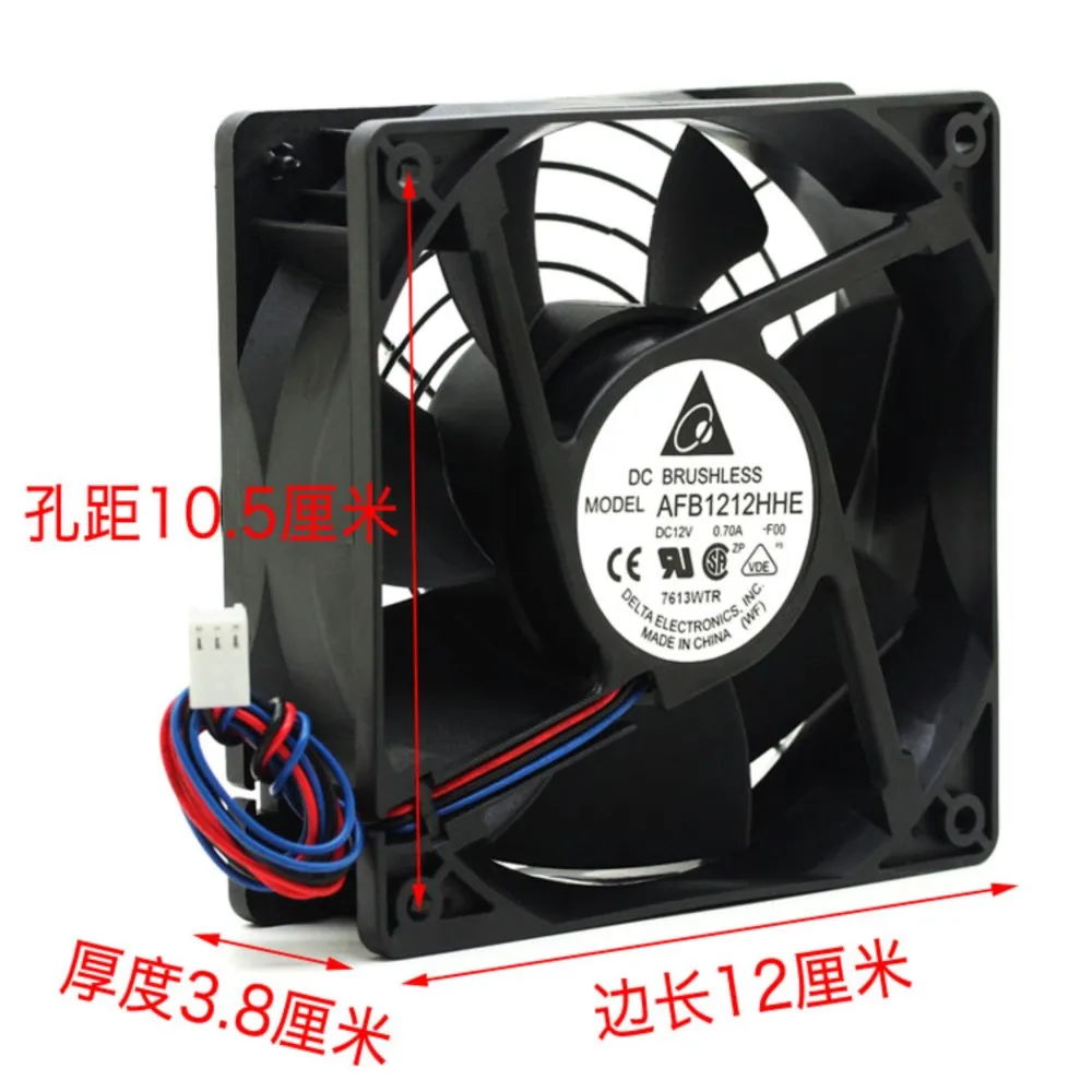 Marca: DELTA Productor: Delta Electronics Public Co., Ltd Modelo: AFB1212HHE Tamaño: 120 * 120 * 38 mm Rodamiento: rodamiento de bolas doble Voltaje estándar: 12 V Corriente: 0. 70A (gran volumen de aire) Velocidad: 2900rpm Potencia: 8. 4W Volumen de aire: 130. 80 CFM Presión del viento: 11. 48 mmh20 Ruido: 36. 4dBA El mejor tiempo de funcionamiento continuo: 100000 horas Conector del ventilador: Conector 3P de la placa principal Longitud del cable del ventilador: 20 CM Características: rodamiento de bolas doble sin mantenimiento, larga vida útil, con suficiente volumen de aire de refrigeración y presión de aire.