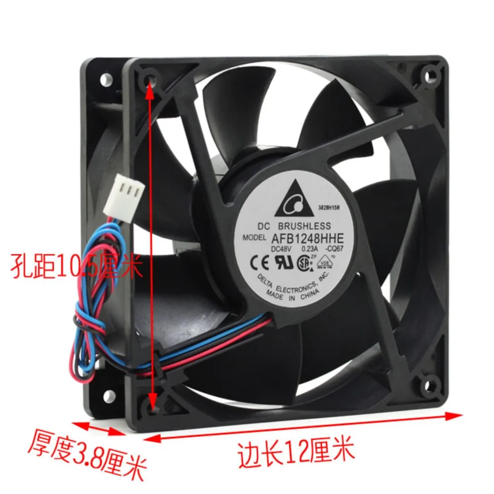 Brand: DELTA Model: AFB1248HHE Size: 120 x 120 x 38mm Voltage: 48V Current: 0.23A Actual current: 0.15A Speed: 2900rpm Air volume: 120.07cfm Noise: 44dBA Weight: 256g Bearing: double ball bearing