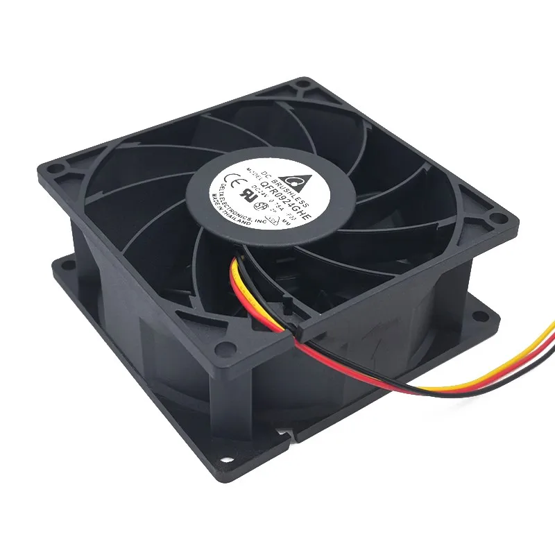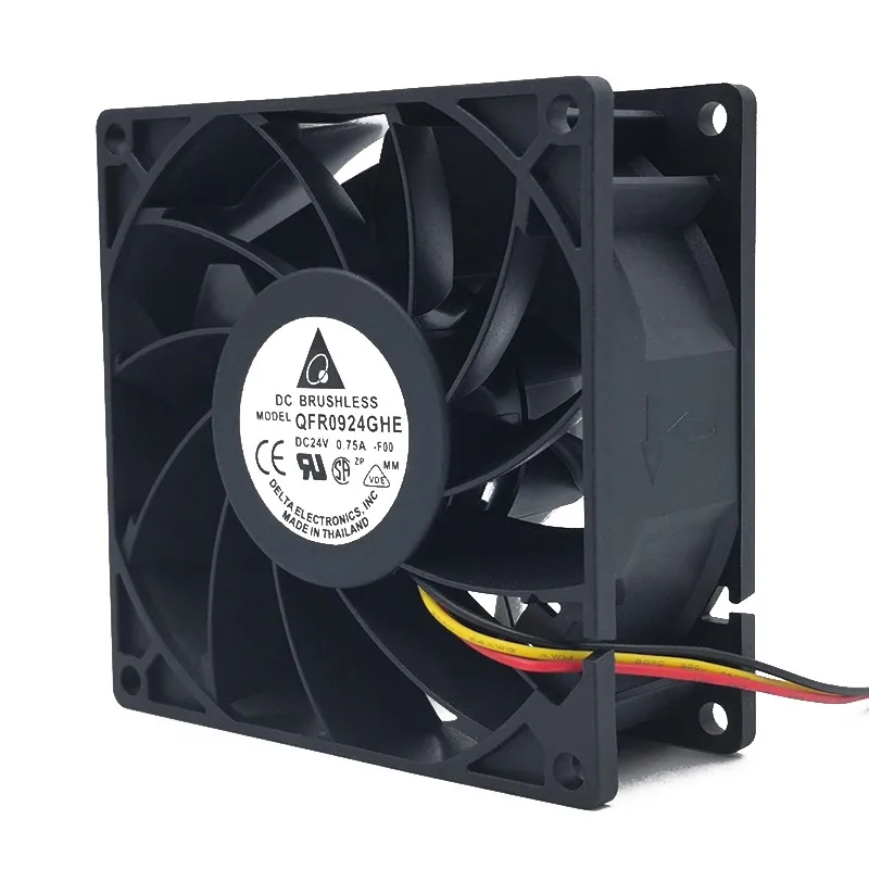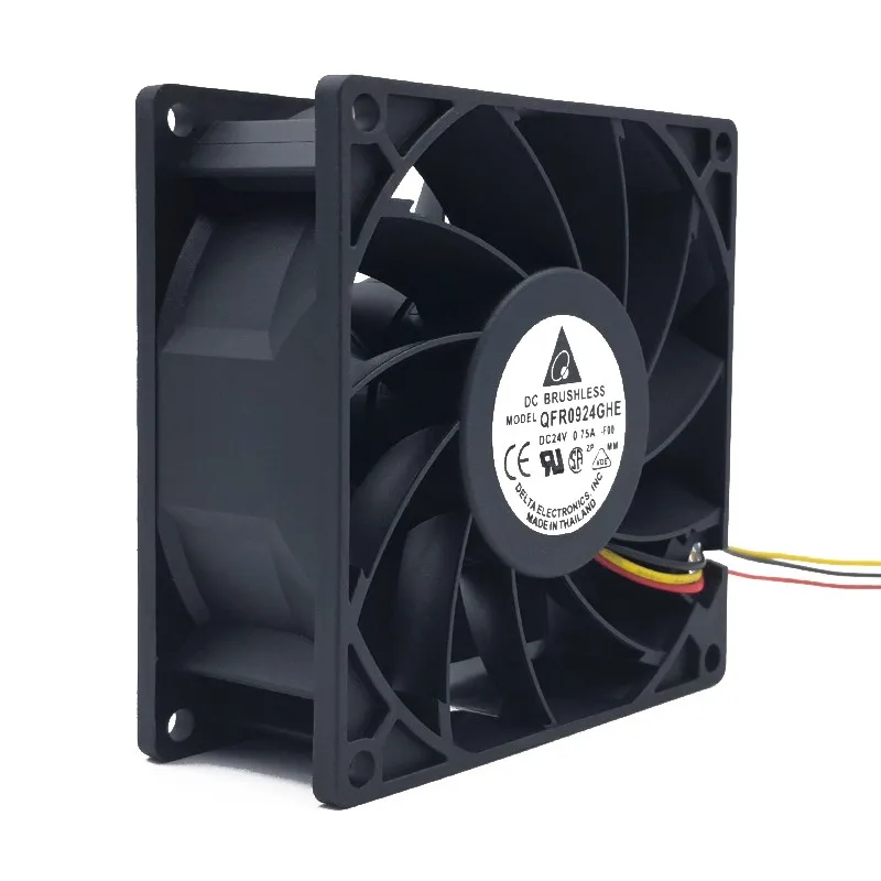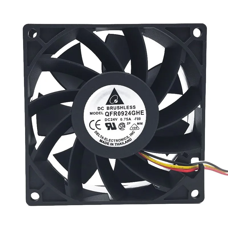 Product Description: The Delta QFR0924GHE is a high-performance industrial cooling fan designed for efficient heat dissipation in demanding applications. With dimensions of 90mm x 90mm x 38mm, this fan operates at 24V DC and 0.75A, delivering powerful airflow to keep critical equipment cool. Featuring high-precision, maintenance-free dual ball bearings, it ensures long-lasting reliability and durability in high-temperature environments. Key Features: Brand & Model: Delta QFR0924GHE Size: 90mm x 90mm x 38mm Voltage & Current: 24V DC, 0.75A High-Airflow Design: Optimized for efficient cooling performance Durable Construction: High-quality materials for industrial applications Dual Ball Bearings: Precision bearings for extended lifespan and 24/7 operation Reliable Performance: Designed for continuous use in demanding environments Applications: Industrial inverters and frequency converters Power supply cooling in automation and control systems High-performance computing and networking equipment Servers, data centers, and telecom infrastructure HVAC and ventilation systems With its high airflow capacity and durable bearing system, the Delta QFR0924GHE is the perfect cooling solution for industrial, commercial, and high-power electronic systems requiring reliable heat dissipation.