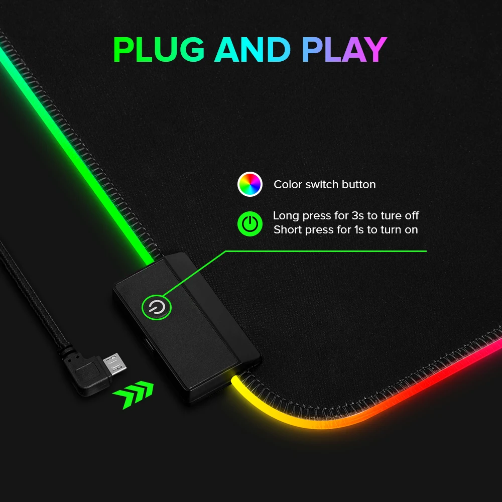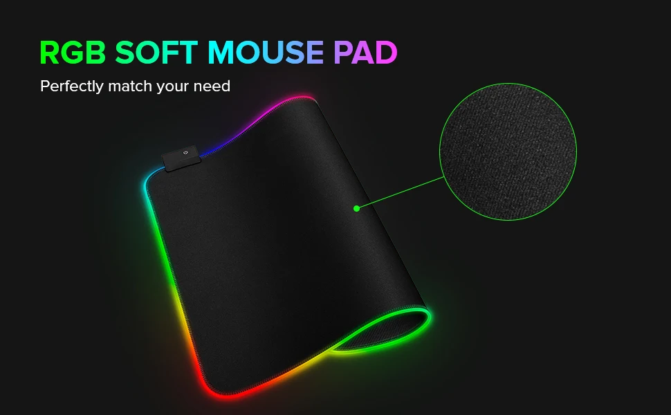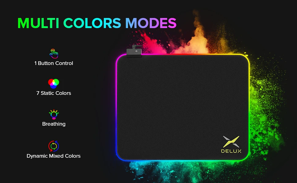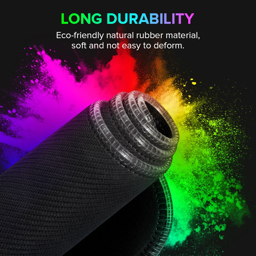 [Iluminación RGB dinámica] Con varios efectos de luz de respiración mixta dinámica y 7 colores estáticos, Esta alfombrilla de ratón ofrece una experiencia de juego perfecta. El control de un botón hace que sea fácil de operar y cambiar los efectos de luz.