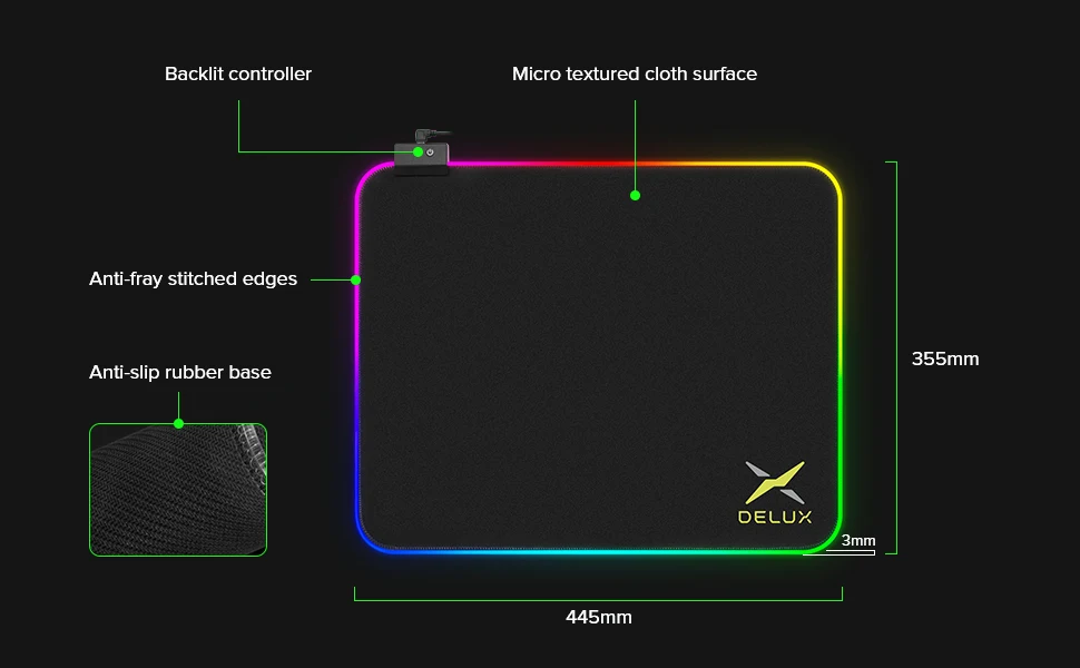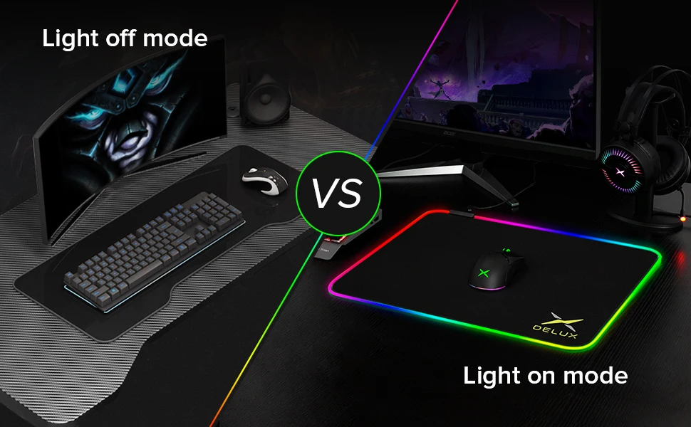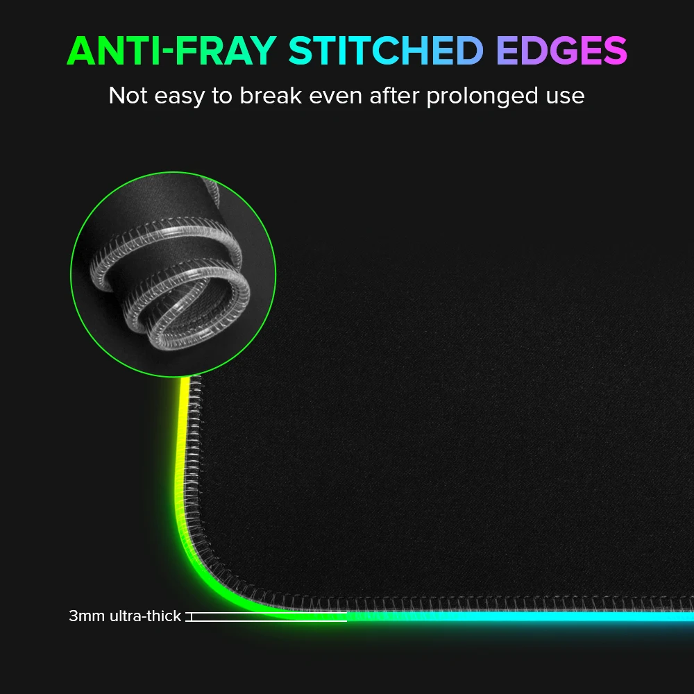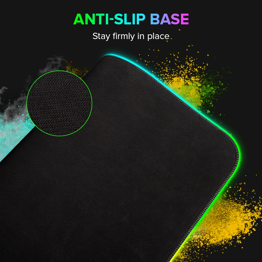 [Iluminación RGB dinámica] Con varios efectos de luz de respiración mixta dinámica y 7 colores estáticos, Esta alfombrilla de ratón ofrece una experiencia de juego perfecta. El control de un botón hace que sea fácil de operar y cambiar los efectos de luz.