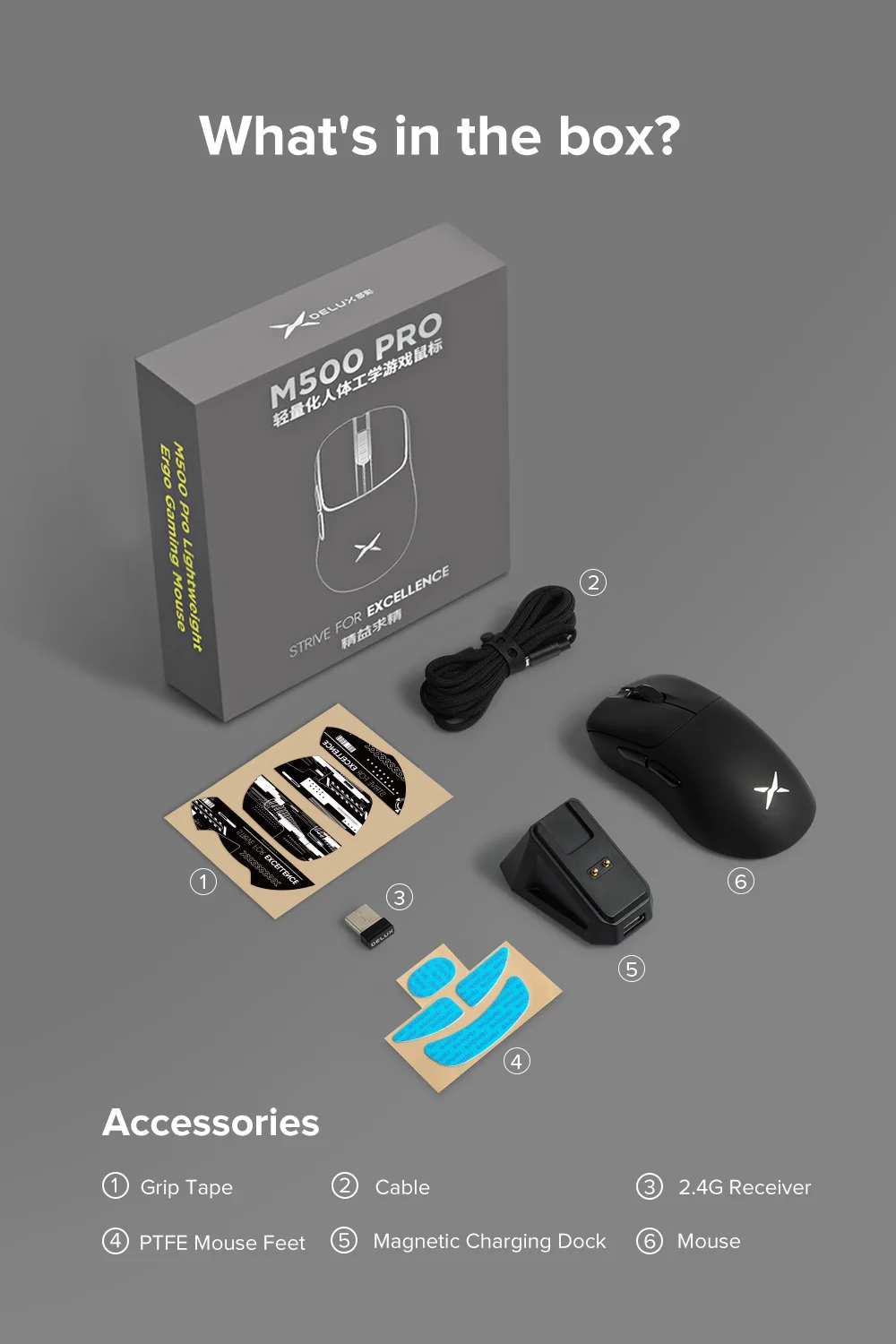 1. de agarre Cinta; 2.Cable; 3. Receptor; 4. Pies PTFE de ratón de; 5. Base de carga magnética 6. Ratón