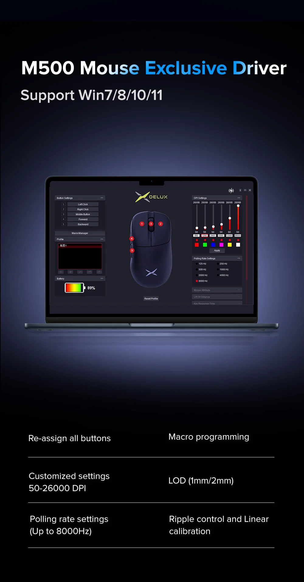 · DPI : 400 (rojo)-800 (verde) (por defecto) -1200 (azul)-1600 (púrpura)-3200 (amarillo)-5000 (blanco); Hasta 26000