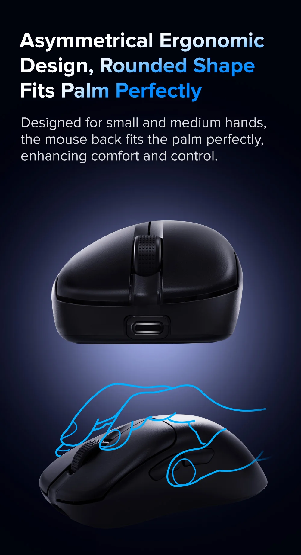 Diseñado para manos pequeñas y medianas, la parte trasera del ratón se ajusta perfectamente a la palma de la mano, mejorando la comodidad y el control.