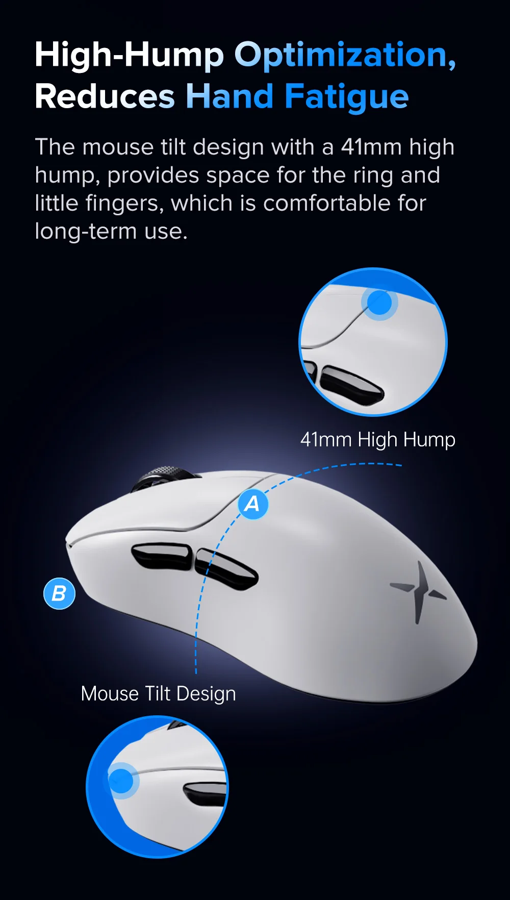 El diseño de inclinación del ratón con una joroba de 41mm de alto, proporciona espacio para los dedos, que es cómodo para un uso a largo plazo.