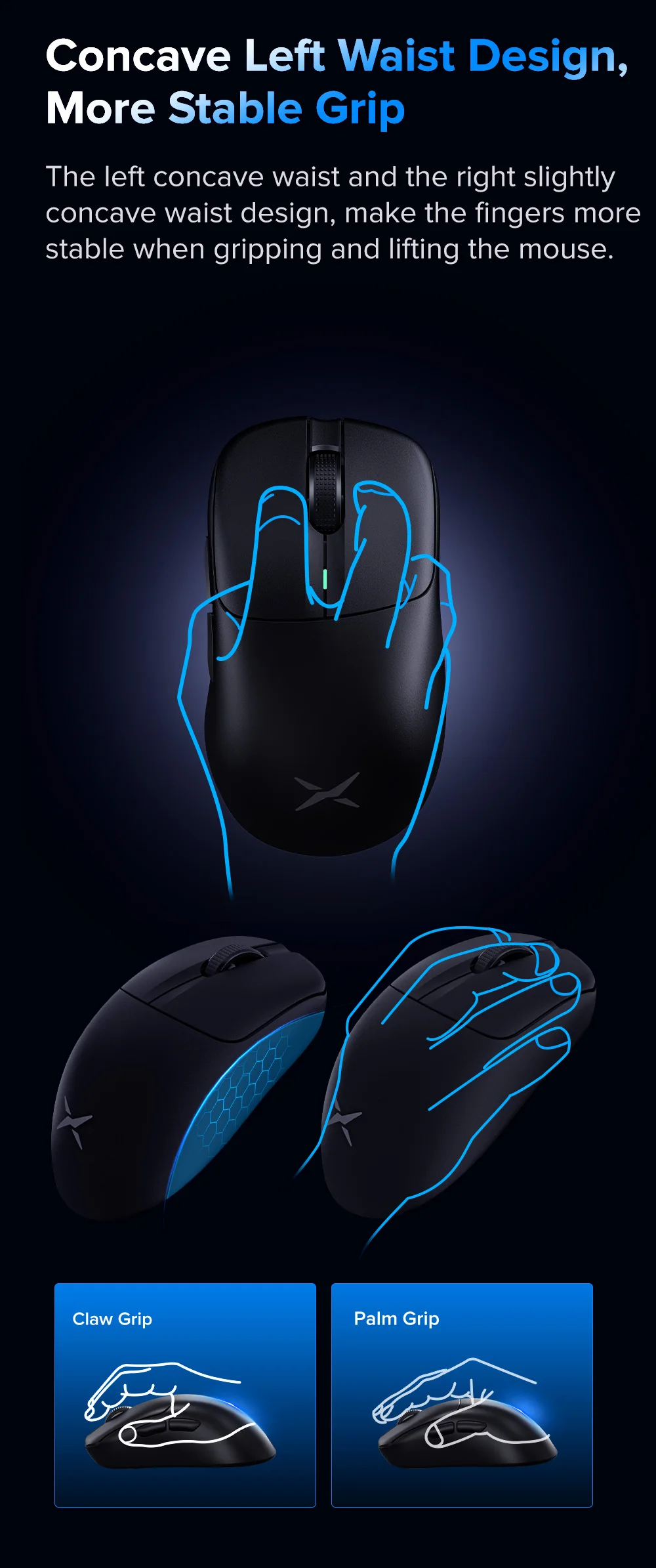 La cintura cóncava izquierda y el diseño de cintura ligeramente cóncava derecha hacen que los dedos sean más estables al agarrar y levantar el ratón.