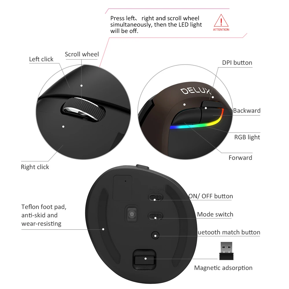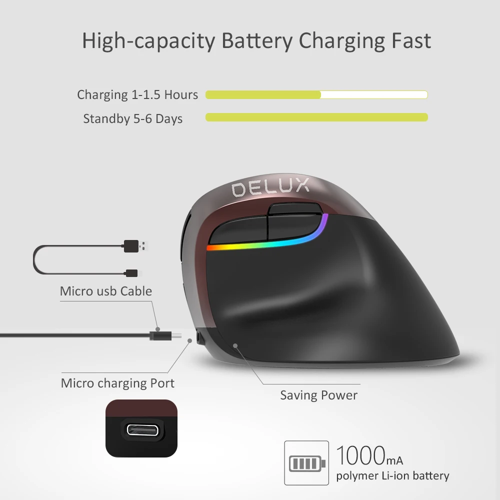 Delux M618Mini Bluetooth 4,0 + 2,4G Ratón inalámbrico silencioso Vertical 4 Gear DPI RGB Ratón ergonómico recargable para PC Laptop Teléfono inteligente