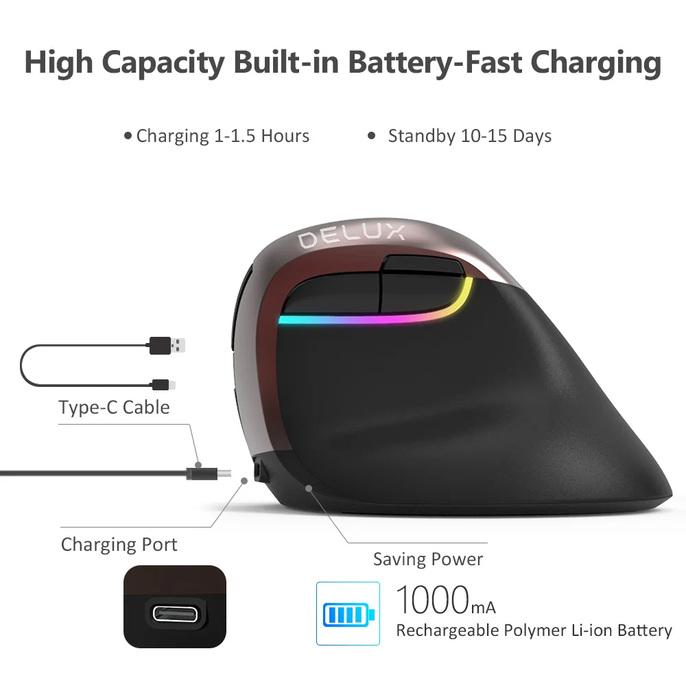 Delux M618Mini Bluetooth 4,0 + 2,4G Ratón inalámbrico silencioso Vertical 4 Gear DPI RGB Ratón ergonómico recargable para PC Laptop Teléfono inteligente