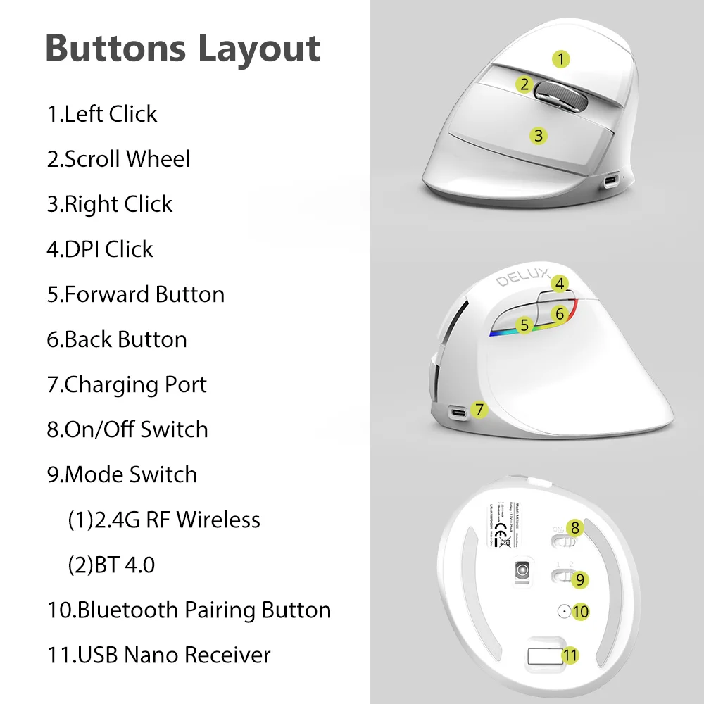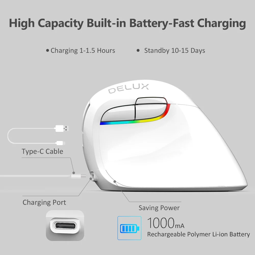 Ratón Vertical silencioso inalámbrico Delux M618Mini Bluetooth 4,0 + 2,4G 4 engranajes DPI ratones recargables ergonómicos RGB para PC portátil teléfono inteligente