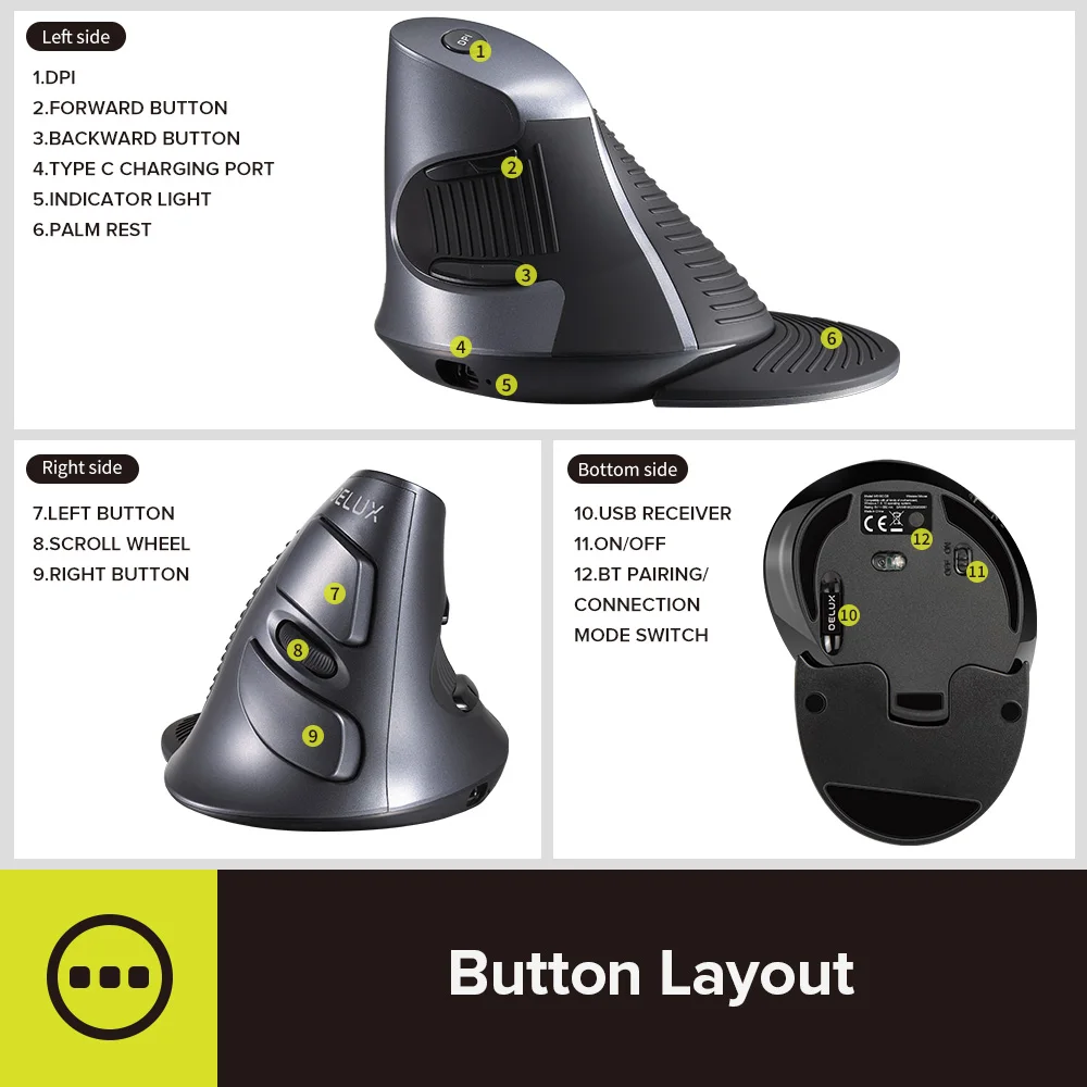 Comprar Delux-ratón Vertical M618 con cable/inalámbrico, periférico óptico ergonómico para mano derecha, DPI ajustable para PC, Mac y oficina, 6 botones