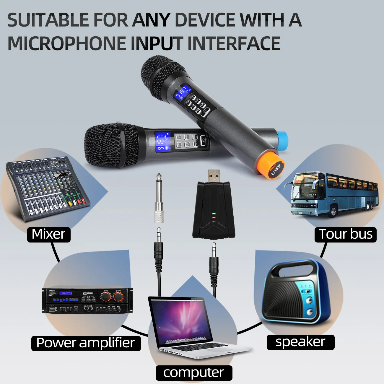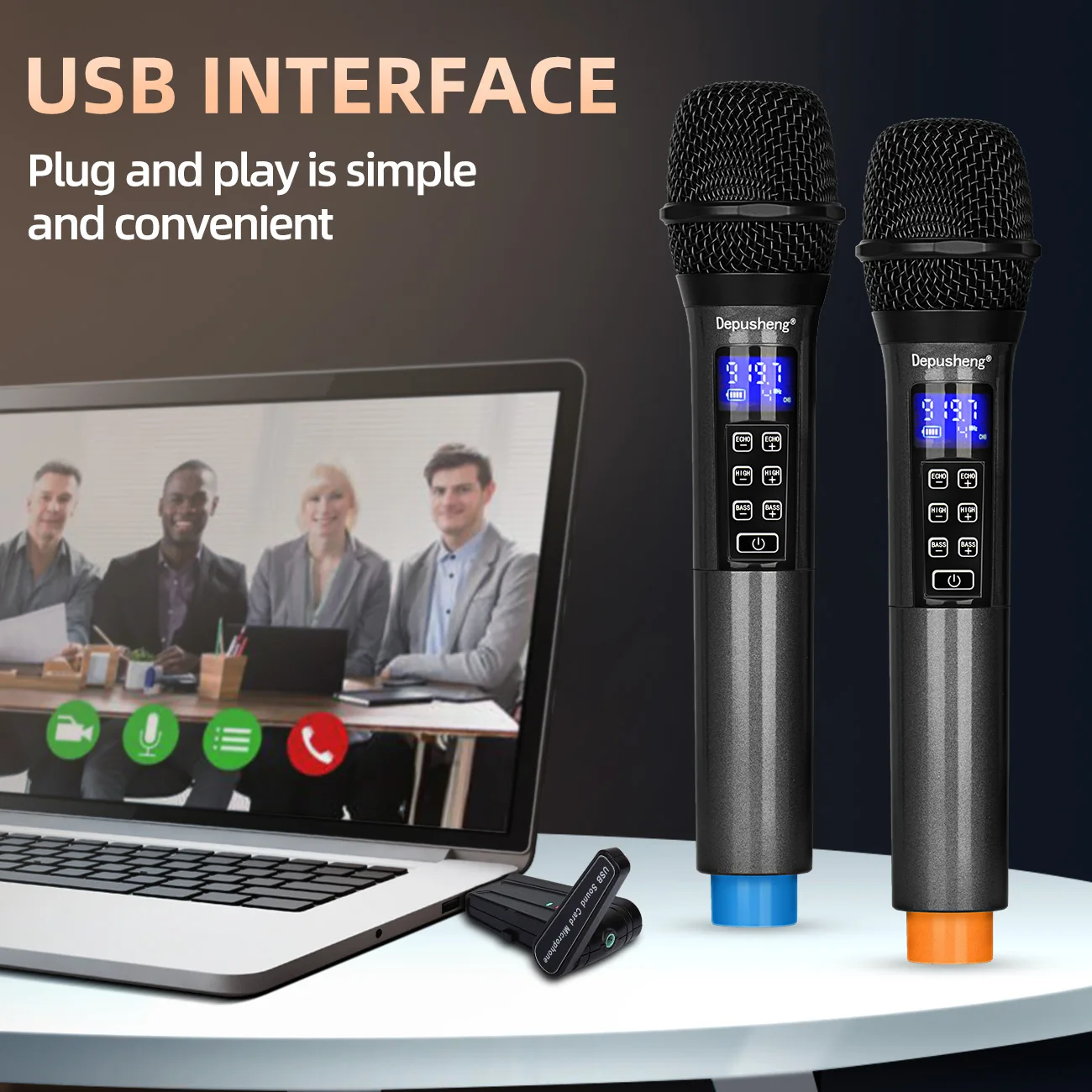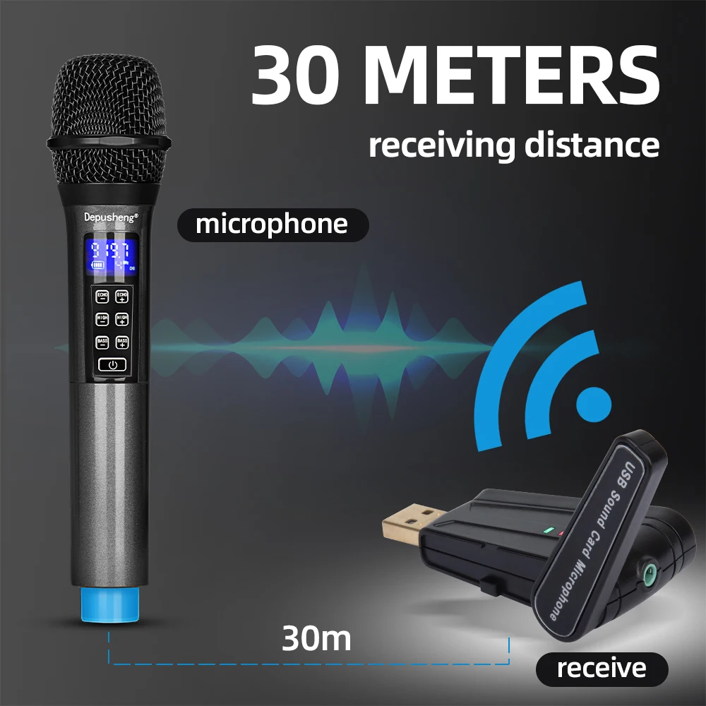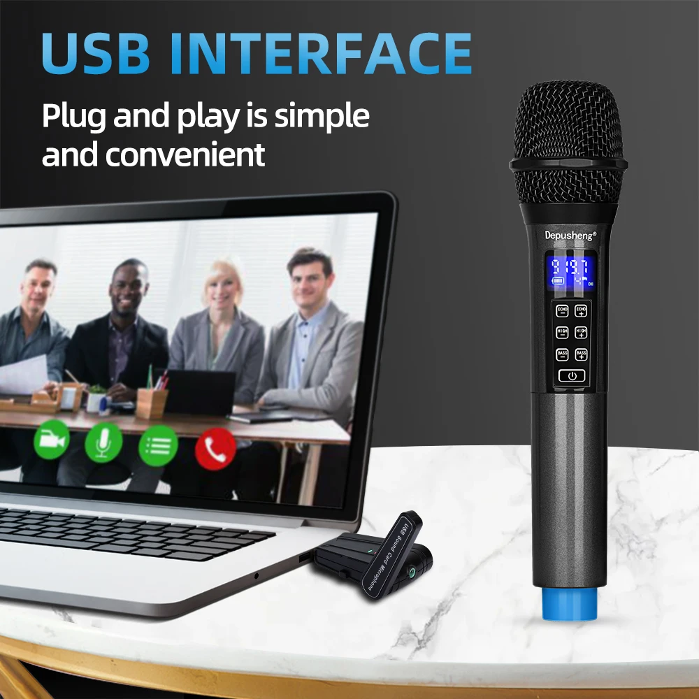 SISTEMA DE MICRÓFONO INALÁMBRICO USB PROFESIONAL: Distancia inalámbrica de aproximadamente 98 pies (30M). Utilice un micrófono cardioide condensador de alta sensibilidad, la señal digital USB es una voz clara ● Estabilidad de la señal ● Sin demora ● Sin radiación ● Anti aullidos ● Anti-interferencias. ● Admite hasta 15 grupos de micrófonos en el mismo entorno al mismo tiempo, mantenga los números de canal de cada micrófono de grupo en la pantalla de visualización inconsistentes (presione CH +/CH-para cambiar de canal).