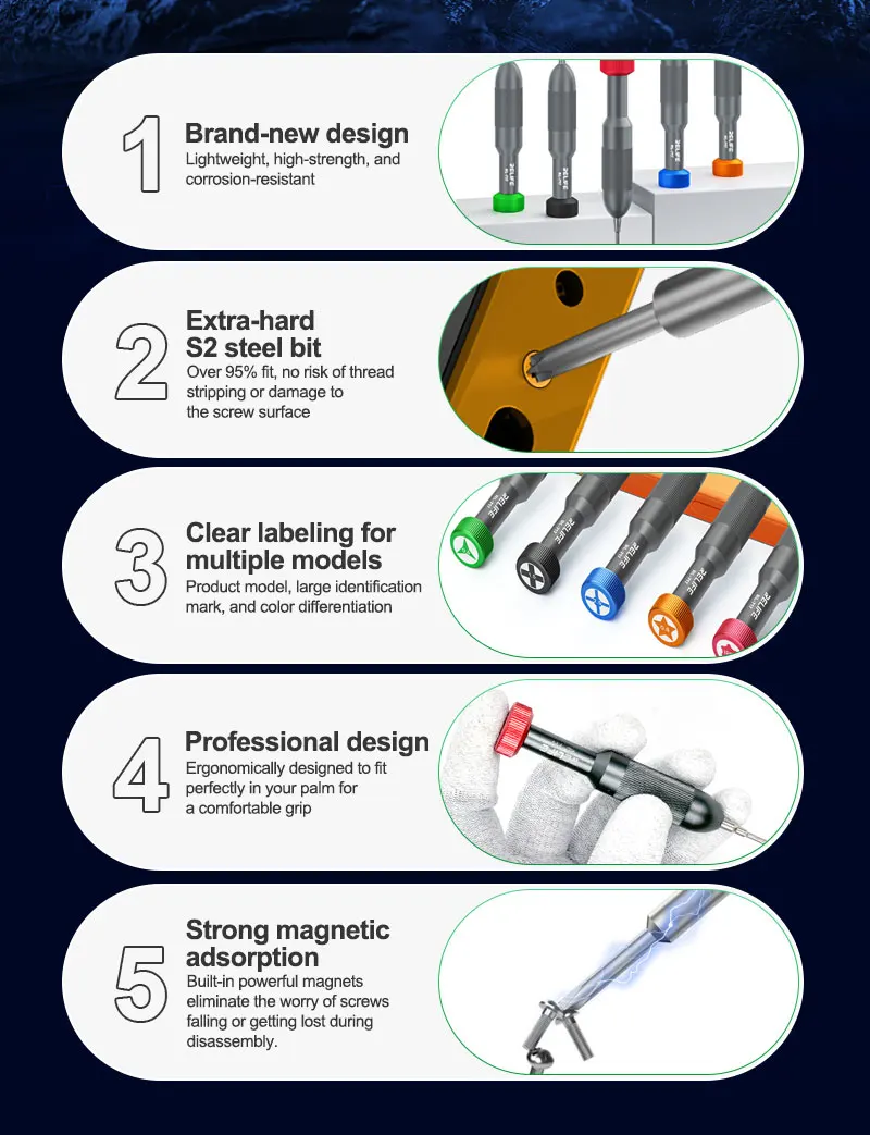 •Cubre con precisión especificaciones como Y0.6, Pentalobe 0,8, lp17, etc., ¡lo que facilita el manejo del desmontaje de tornillos de precisión!
