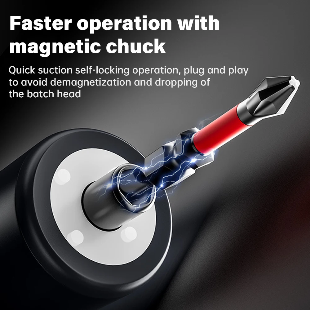 1. MOTOR SIN ESCOVAS: Con un potente motor magnético sin escobillas, el destornillador eléctrico es adecuado para una variedad de aplicaciones de perforación y fijación.Con una velocidad sin carga de hasta 200 rpm, el destornillador hexagonal le permite cambiar rápidamente las puntas del destornillador para satisfacer sus necesidades.