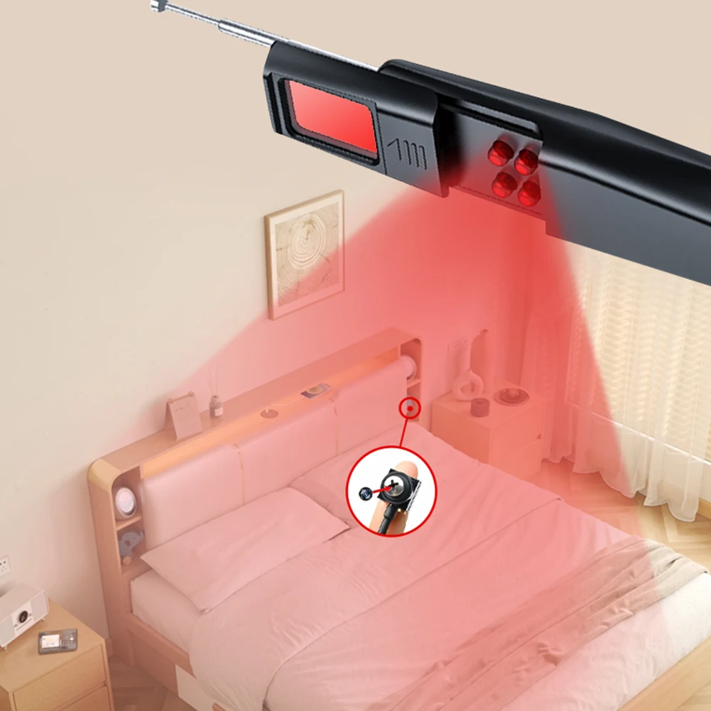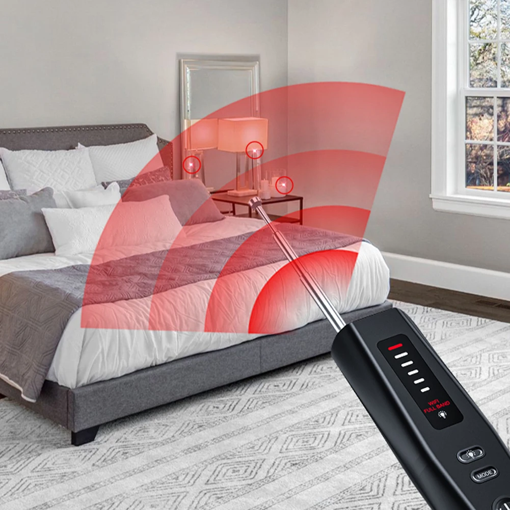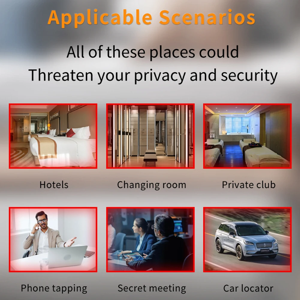 2.Amplio rango de frecuencia: Este detector de cámara y errores ocultos cubre un rango de frecuencia de detección de 1 MHz a 6,5 GHz, capaz de identificar comunicaciones modernas como GSM, 3G, 4G, 5G, compatible con Bluetooth y Wi-Fi (2,4G y 5,8G).Cuenta con dos modos: sonido y vibración.