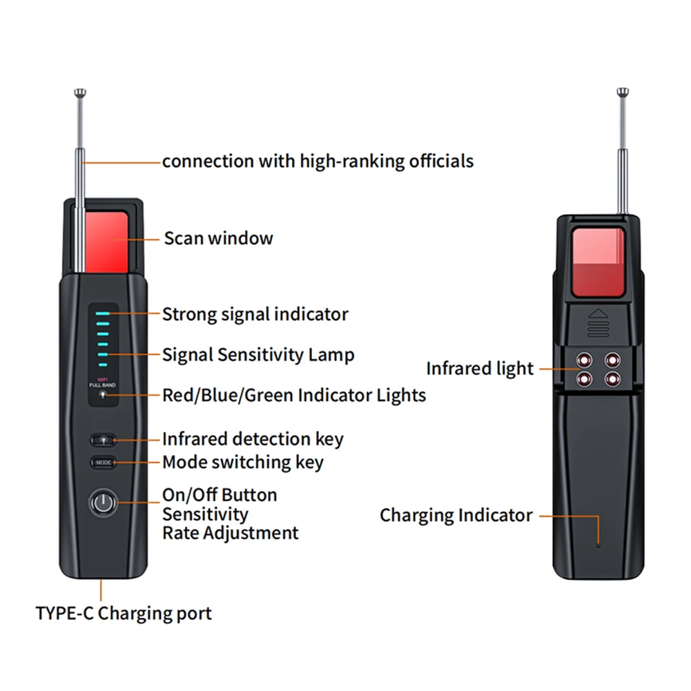 4.Portátil y fácil de usar:El escáner de señal inalámbrico Bug RF del dispositivo de escucha es compacto y fácil de transportar, con un diseño de antena oculta.Perfecto para operaciones discretas, especialmente al escanear áreas sensibles de cámaras.