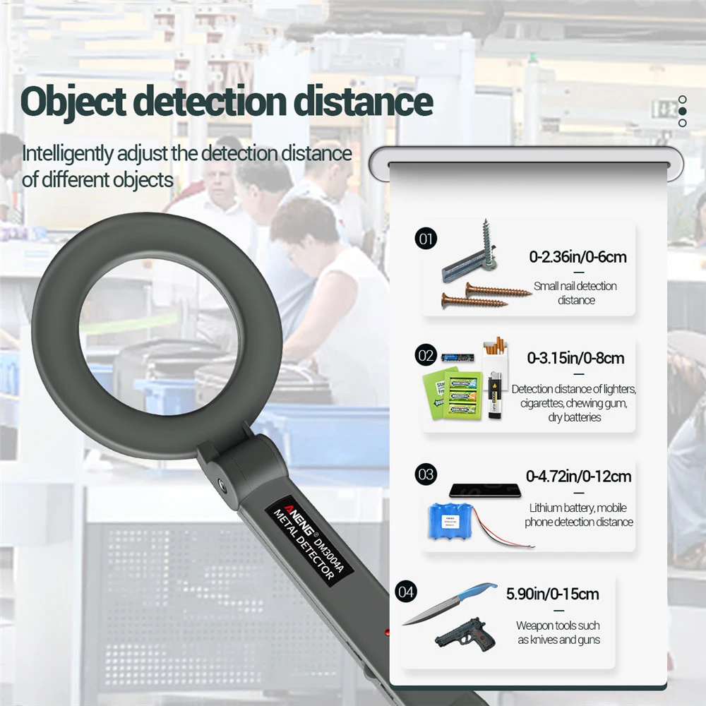 Chincheta pequeña, distancia de detección de clavos de hierro 0-6cm, encendedor, distancia de detección de cigarrillos 0-8cm, distancia de detección de producto electrónico 0-12cm, distancia de detección de producto de herramienta de arma 0-15cm