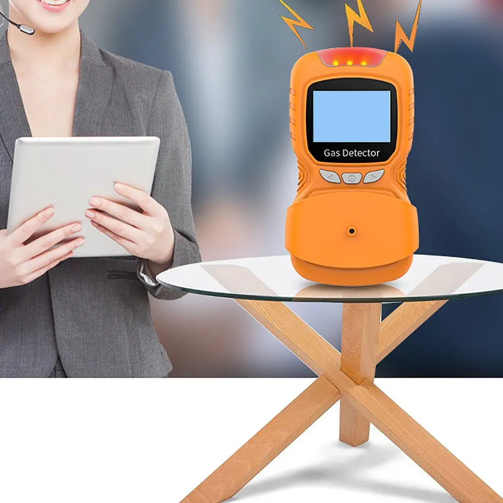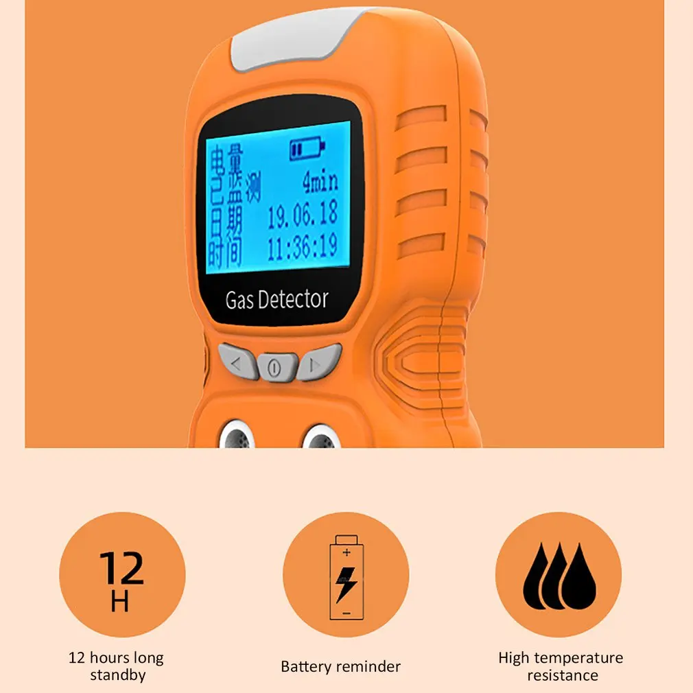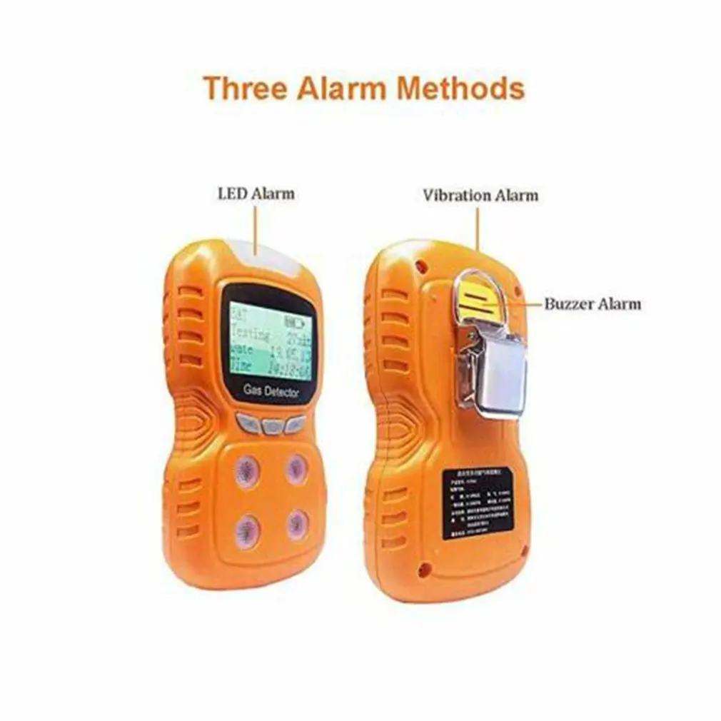 2. Tres métodos de alarma: el detector de gas 4 en 1 de tipo de voz portátil alarmas de audio, visuales y vibración ajustables alertan cuando se alcanzan los niveles preestablecidos. Marca de tiempo y registro digital de alarma.