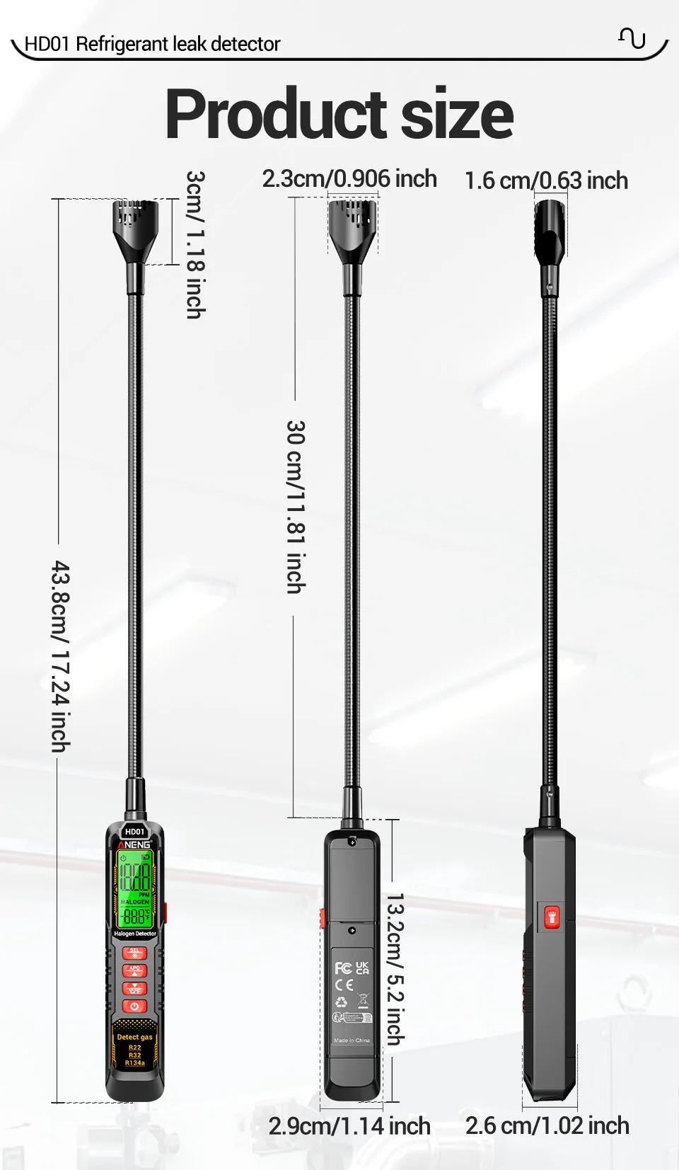 Llegó rápidamente. Funciona correctamente, pero solo puede utilizarse como detector porque la sensibilidad es de 14 g/año. No puedes utilizarlo como una herramienta legalizada. Tiene luz UV al final del sensor. Es muy útil.