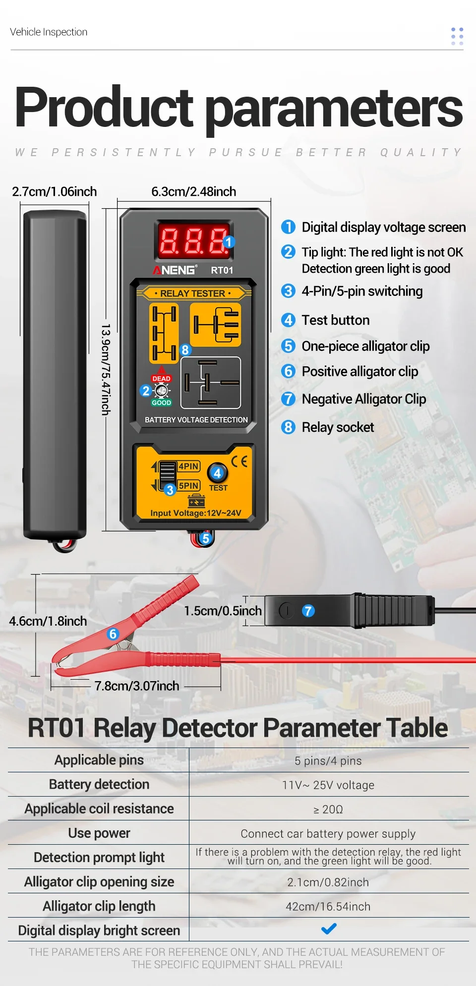 Especificación: Modelo de producto: detector de relé RT01 Pasadores aplicables: 5 pines/4 pines Detección de batería: voltaje de 11 V ~ 25 V Resistencia de la bobina aplicable: ≥20Ω Utilice energía: conecte la fuente de alimentación de la batería del automóvil Luz de aviso de detección: si el probador enciende la luz LED verde, significa que el relé es normal; Si la luz LED roja está encendida significa que el relé no es normal. Tamaño de apertura del clip de cocodrilo: 2,1 cm/0,82 pulgadas Longitud del clip de cocodrilo: 42 cm/16,54 pulgadas Pantalla brillante de pantalla digital: Sí