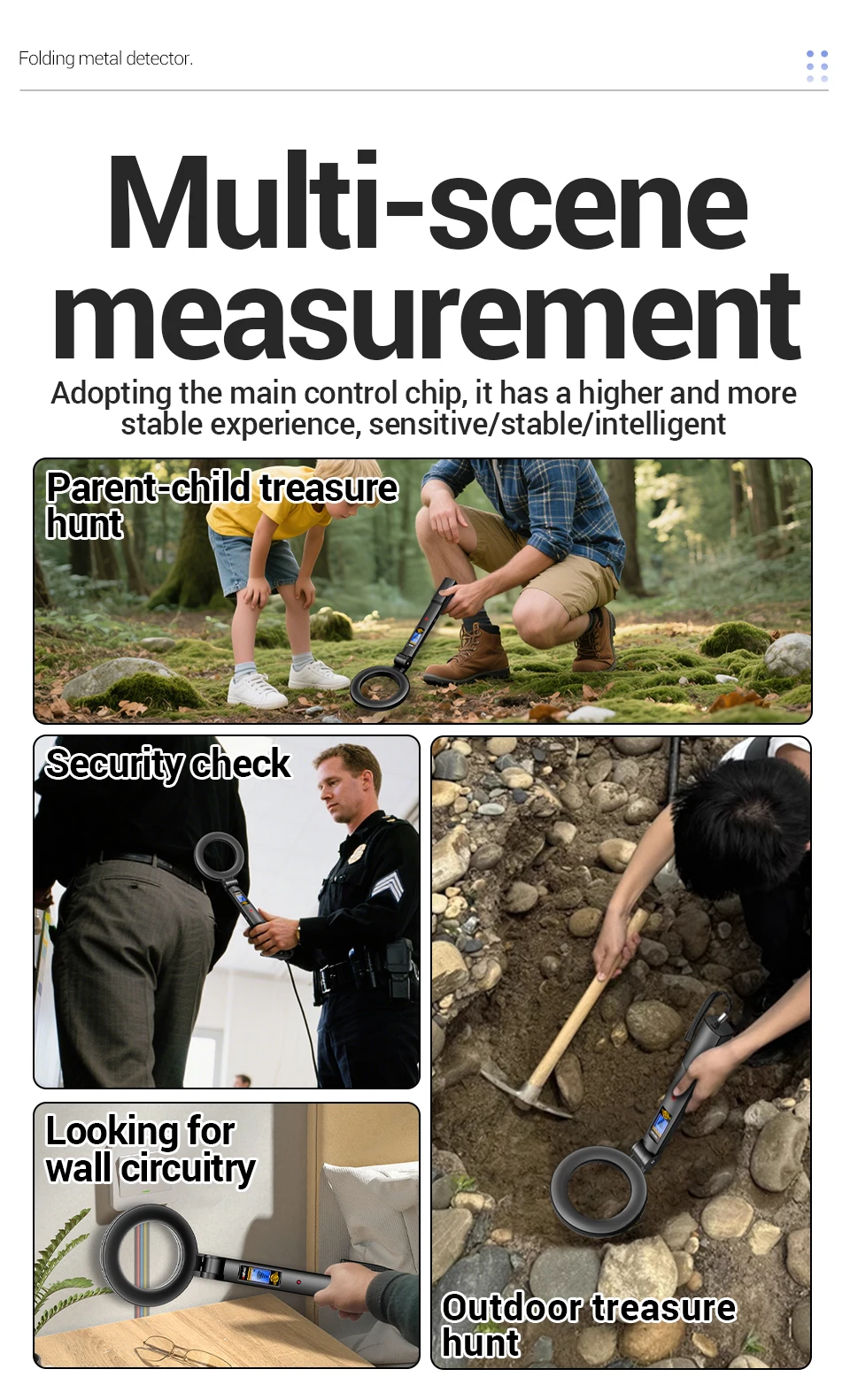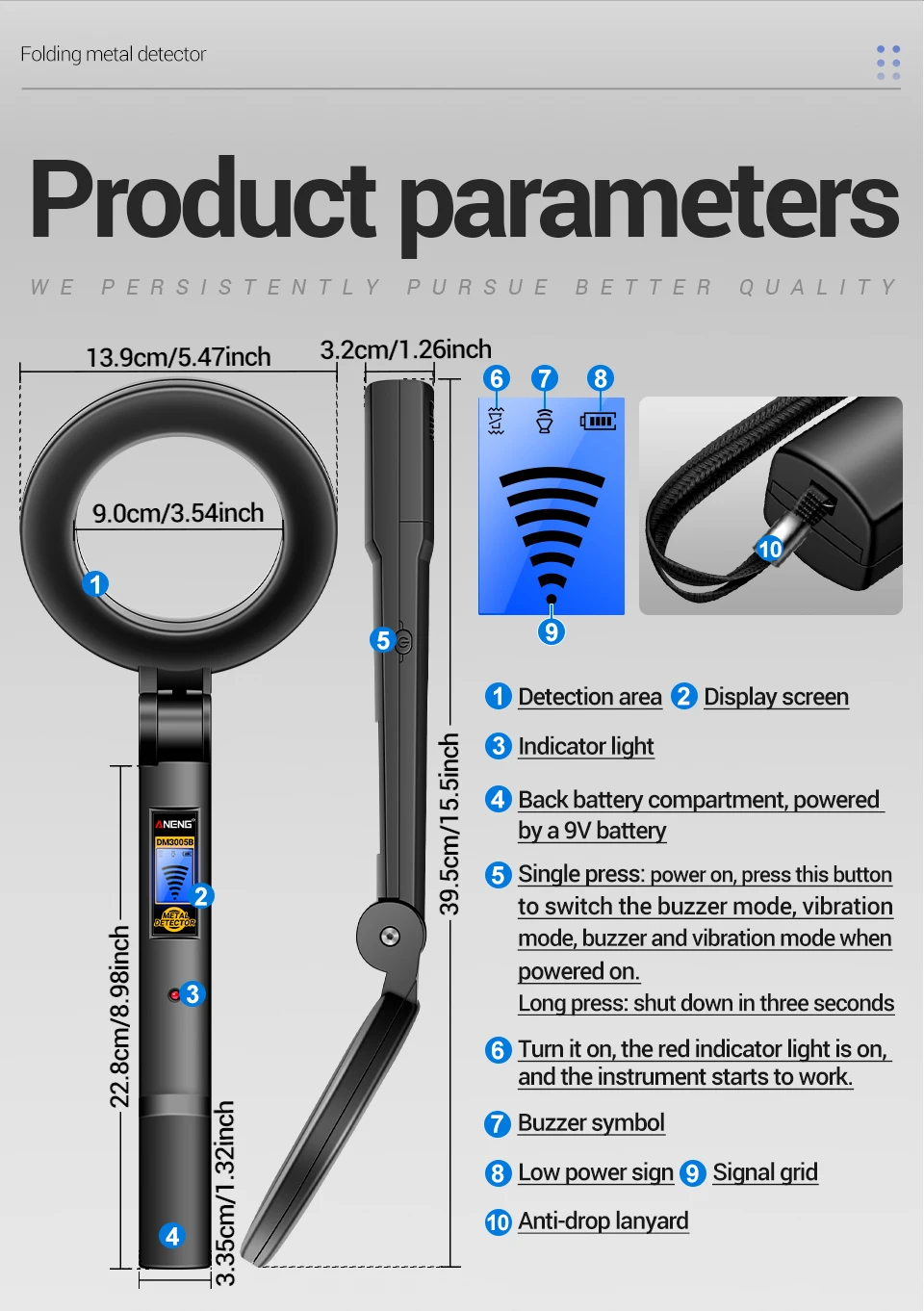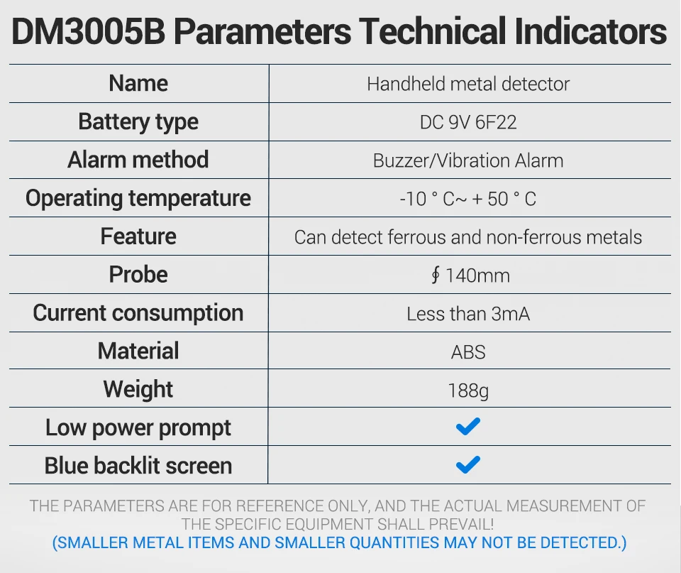 El detector de metales portátil DM3005B detecta metales negros y no ferrosos.También puede localizar objetos metálicos en lugares disfrazados y ocultos, como maletas humanas, paredes de correo y paquetes, paneles de pared, espacios huecos y tierra.