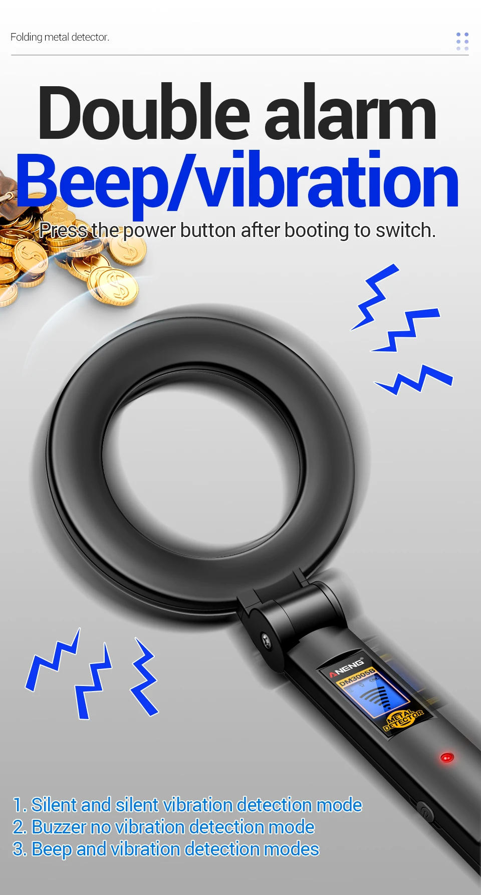 Presione el botón una vez en el estado de apagado para encender el detector de metales, y se activarán tanto el timbre como el motor.Presione el botón nuevamente para apagar el motor, dejando solo el timbre.Presione el botón nuevamente para apagar el timbre, dejando solo el motor.Mantenga presionado el botón durante más de 3 segundos para apagar el detector de metales.