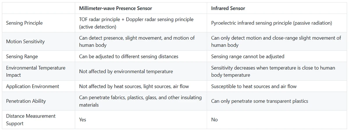 Las diferencias entre el sensor de presencia de onda milimétrica y el sensor de infrarrojos.