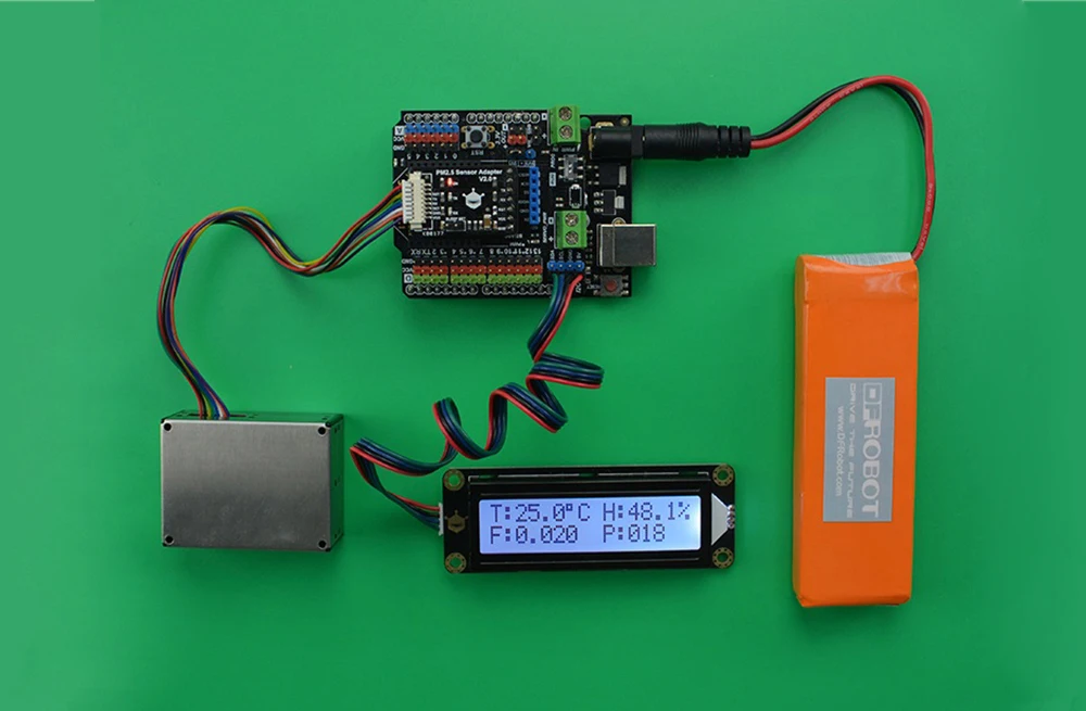 Este monitor de calidad del aire presentado por DFRobot le proporciona mediciones de PM10, PM2.5, PM1.0, así como de temperatura y humedad.Funciona bien con dispositivos como Arduino, STM32.
