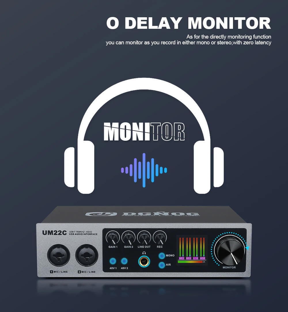【Procesamiento de señal digital y monitoreo en tiempo real】- Aprovechando el chip DSP de Analog Devices, Inc., USA, el UM22C logra un equilibrio dinámico mejorado.Integrado con efectos de procesamiento de señales digitales, permite una latencia ultrabaja, permitiendo el procesamiento de audio en tiempo real durante la grabación.Además, la salida de monitoreo admite auriculares de 16 o 32 ohmios con una potencia máxima de 220 mW, satisfaciendo perfectamente las necesidades de monitoreo profesionales.