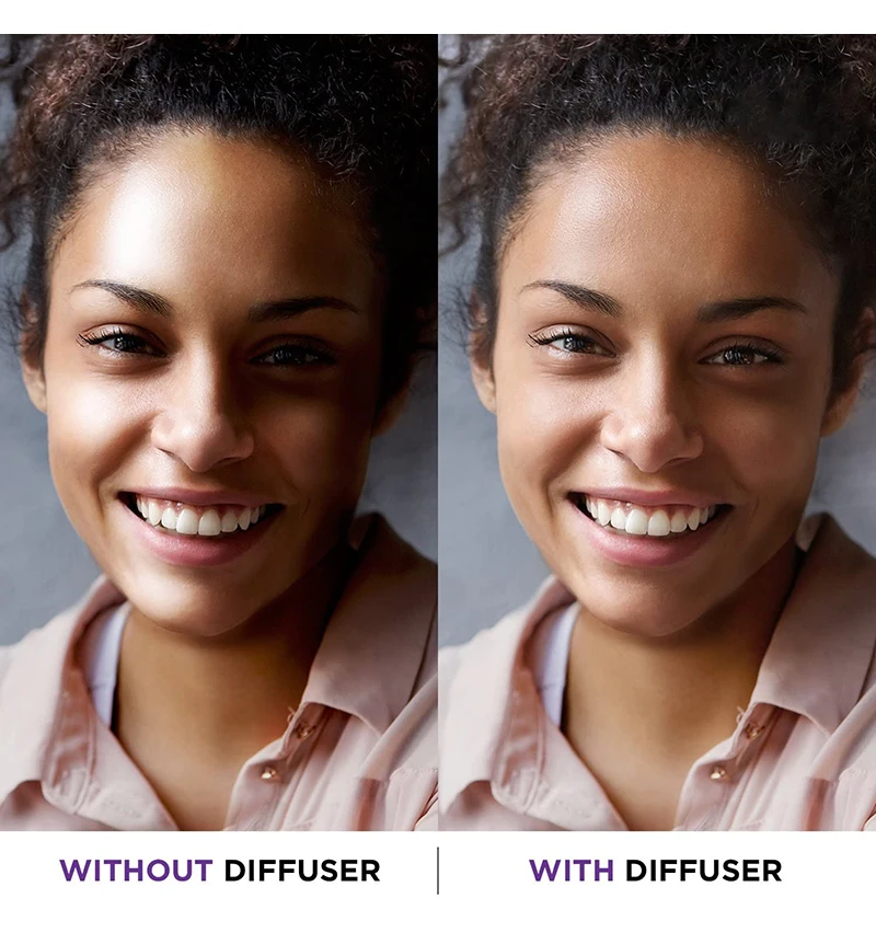 El material de difusión extiende la luz uniformemente sobre tu tema, evitando sombras duras.