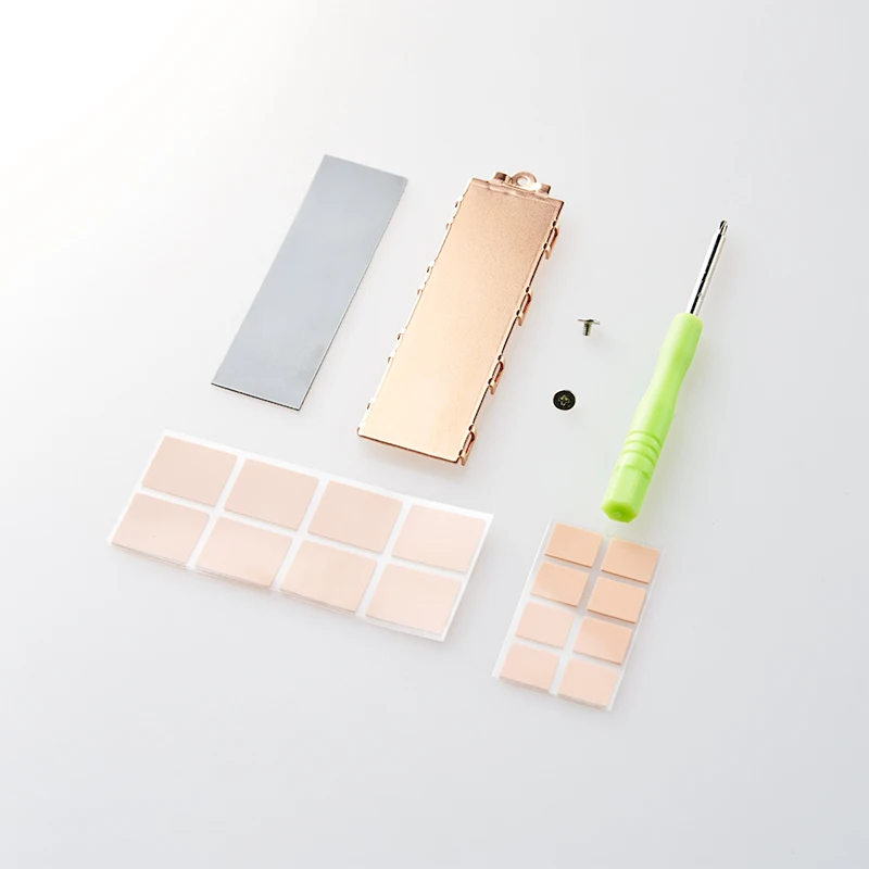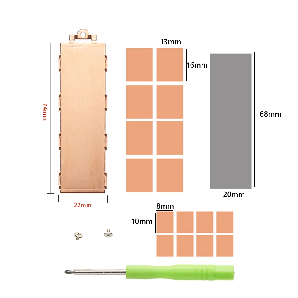 4. Lo que obtendrá:Disipador de calor de 0,8mm * 1 + tornillo de fijación de disco duro * 2 + almohadilla de silicona conductora térmica * 17 + destornillador de succión magnética * 1