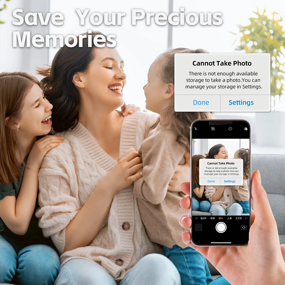 2. Amplia compatibilidad:Este disco duro del teléfono es compatible con iOS y sistemas Android. Simplemente conéctese a su teléfono, abra la aplicación y automáticamente leerá y hará una copia de seguridad de sus fotos, videos, contactos y aplicaciones. Para Compatible con iOS, descargue KTCloud o Exstorage desde la App Store; para Android, escanee el código QR para descargar Exstorage.