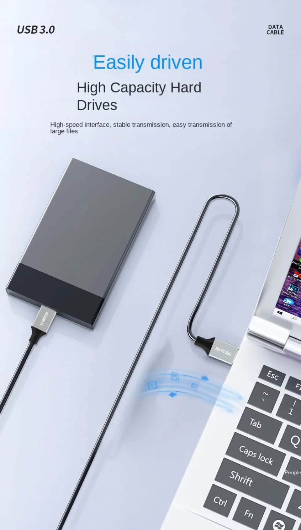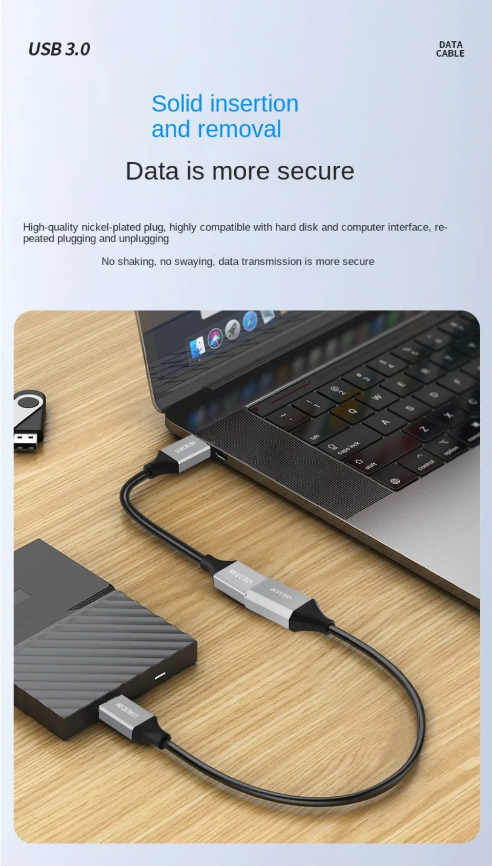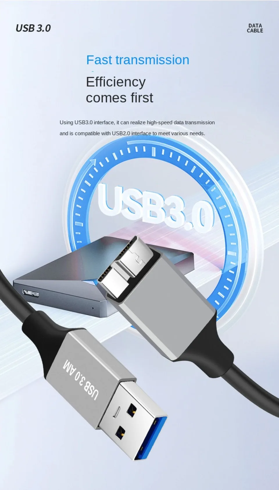 Transmisión de alta velocidad de archivos grandes por segundo La velocidad de transmisión puede alcanzar una velocidad máxima teórica de 5Gbps (USB3.0) Enlace la unidad flash USB al disco duro móvil para una transferencia de archivos de alta velocidad Especificación del núcleo: estándar de cobre de 9 núcleos + papel de aluminio + malla de blindaje trenzado 96 Carga + transmisión de datos Interfaz estándar USB3.0