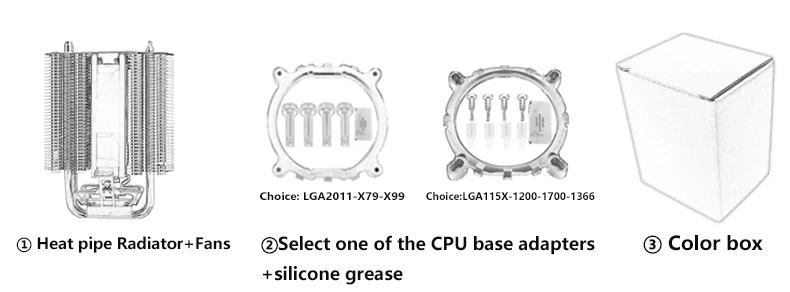 Paquete: Caja de color (refrigerador de CPU*1, soporte de fijación*1 kit, grasa de silicona*1)