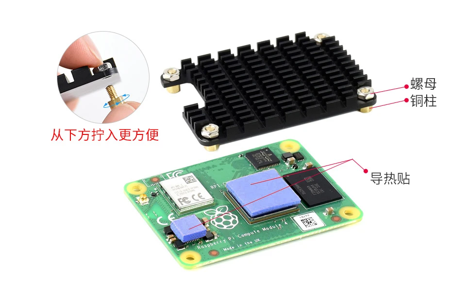 1.Coloque cintas térmicas en el CM4, fije las tuercas y los separadores al disipador.
