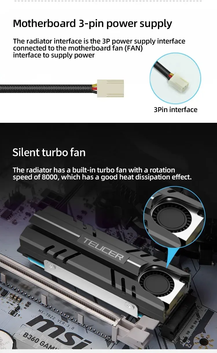 TEUCER Enfriador de disco duro M.2 2280 NVME de aluminio, disipador de calor SSD M.2 con ventilador, disipador de calor