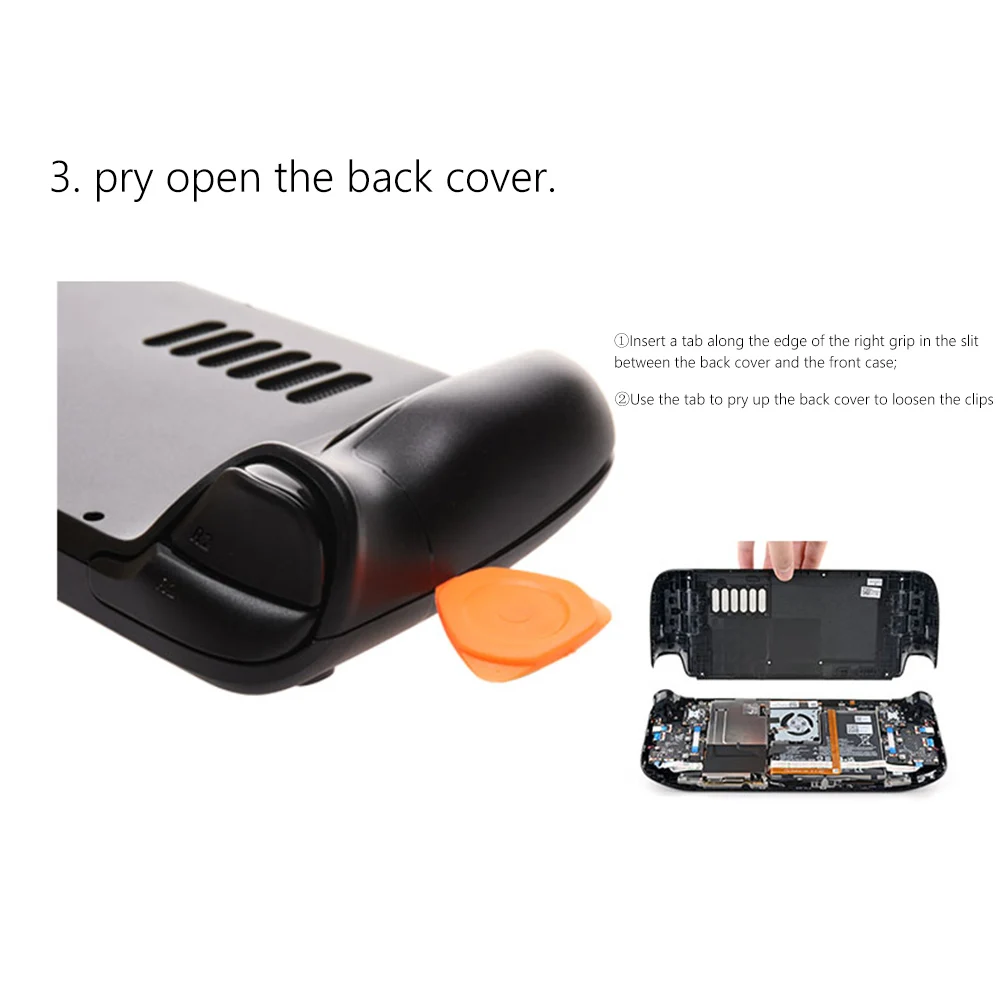 10.Reemplace los ocho tornillos en la parte posterior de STEAM DECK.Sujete la hebilla de la cubierta trasera en el cuerpo; Instale los tornillos del cuerpo para asegurar la cubierta trasera y la instalación estará completa.Nota: