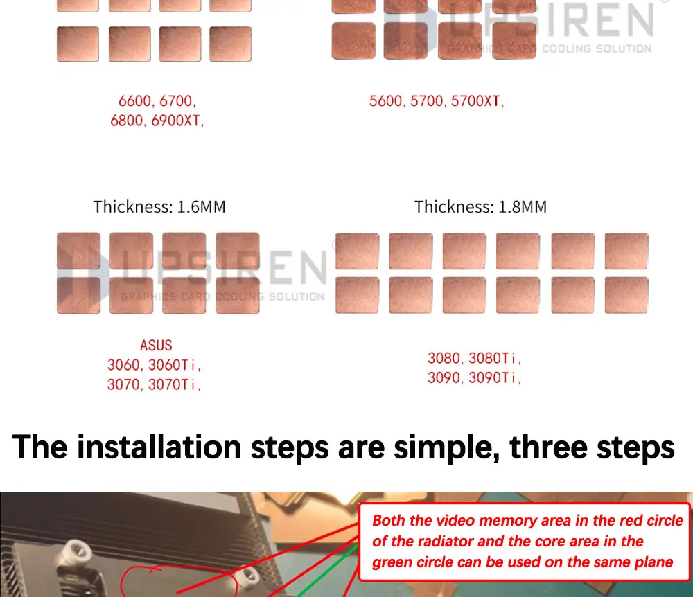 Adecuado para tarjetas gráficas 3070 (ti), 3080 (ti), 3090, 3090Ti con almohadillas térmicas superiores a 2 mm.¡Los modelos personalizados no son adecuados para otros modelos!!